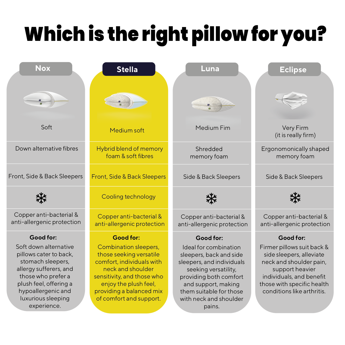 Introducing the Brightr Stella Pillow Adjustable - The Ultimate Hybrid Pillow, a groundbreaking combination of revolutionary memory foam and down alternative fibers. Engineered for the perfect balance of cooling comfort and spine-tingling support, this pillow redefines the standard for a restful night's sleep.