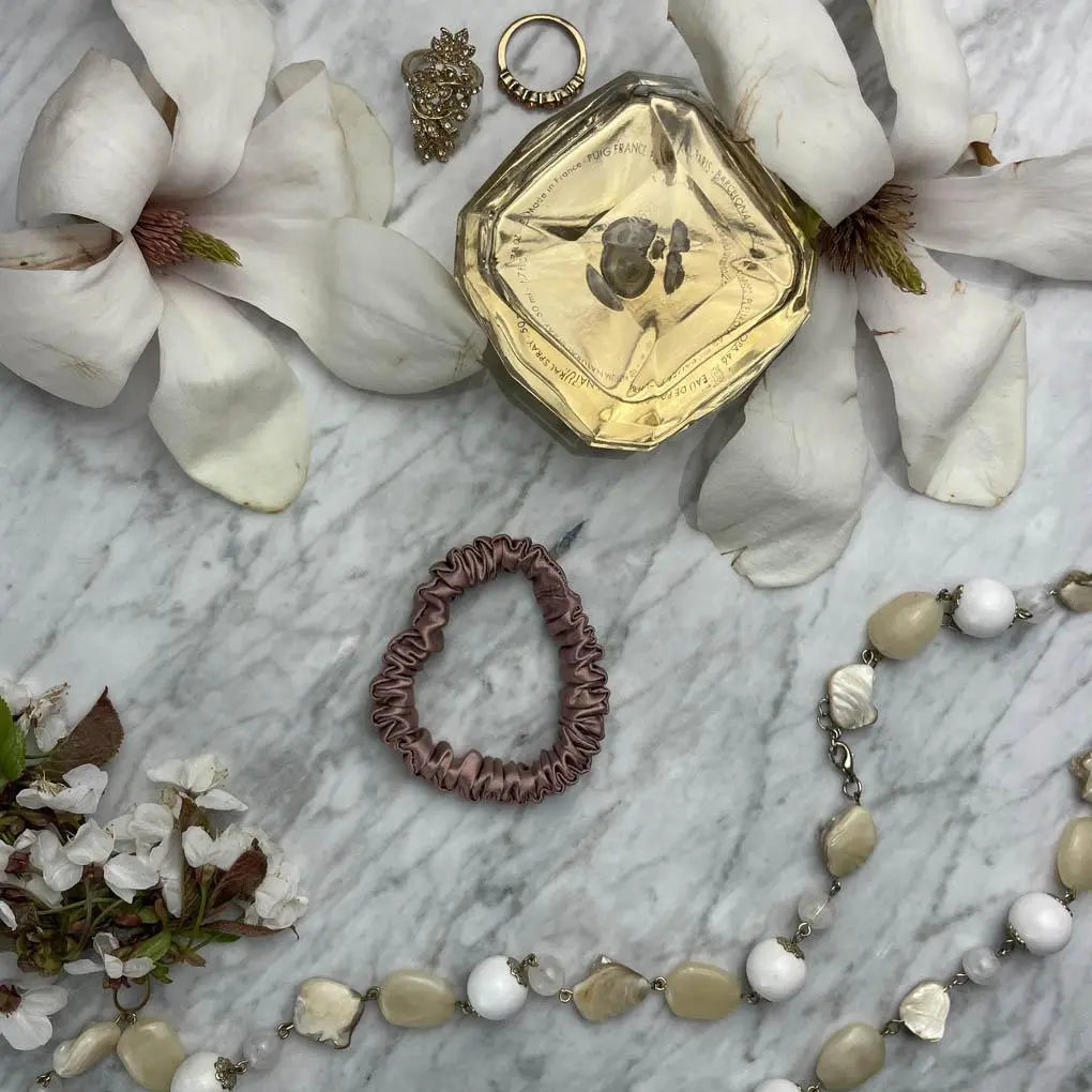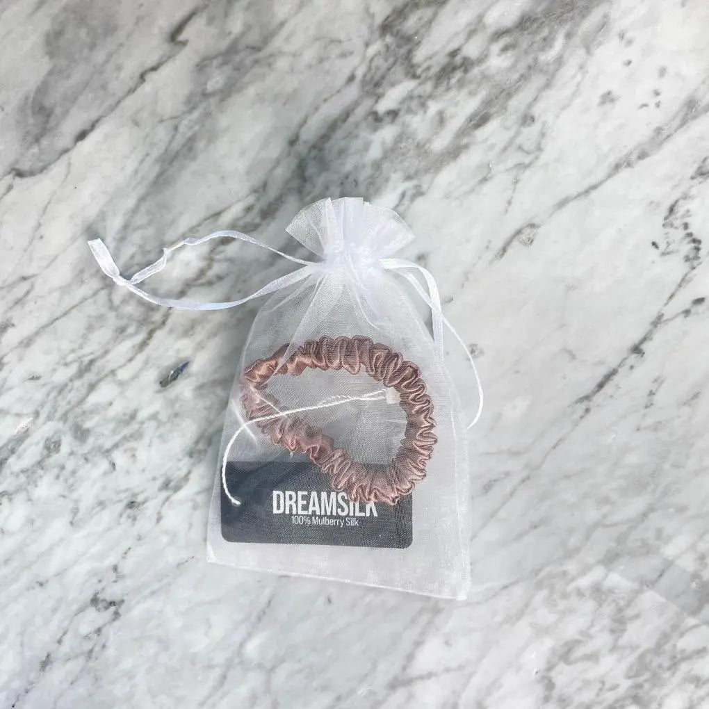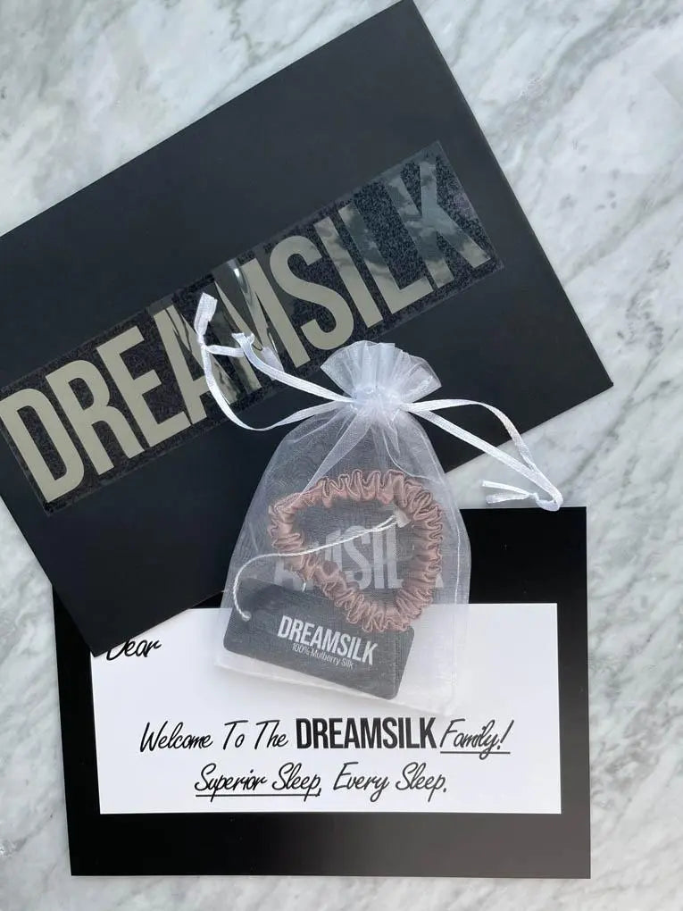 DREAMSILK's™ silk scrunchies that glide over your hair like moonlight over water.