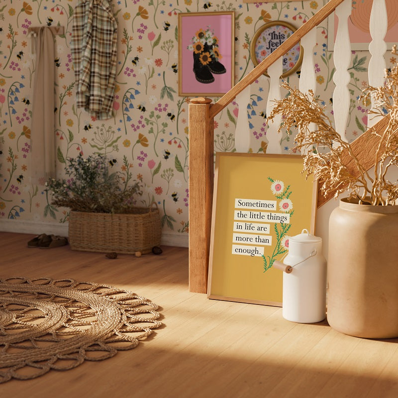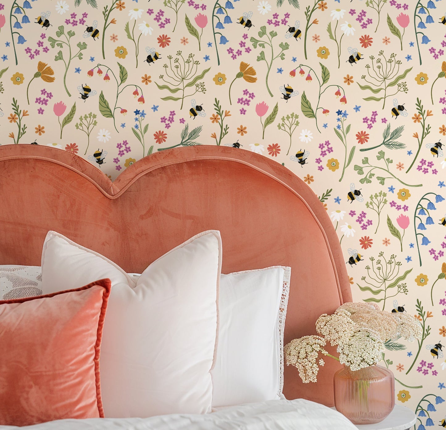 Un-bee-lievably sweet! A spacious coquette meadow pattern in a a soft spring colour palette. Wild blossoms blow in the breeze whilst the bumblebees dance among them.
