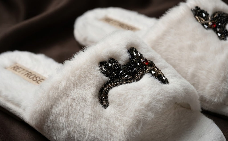 The Callie Cream Luxury Plush Diamanté Embellished Handmade Slipper - RETTROSE
