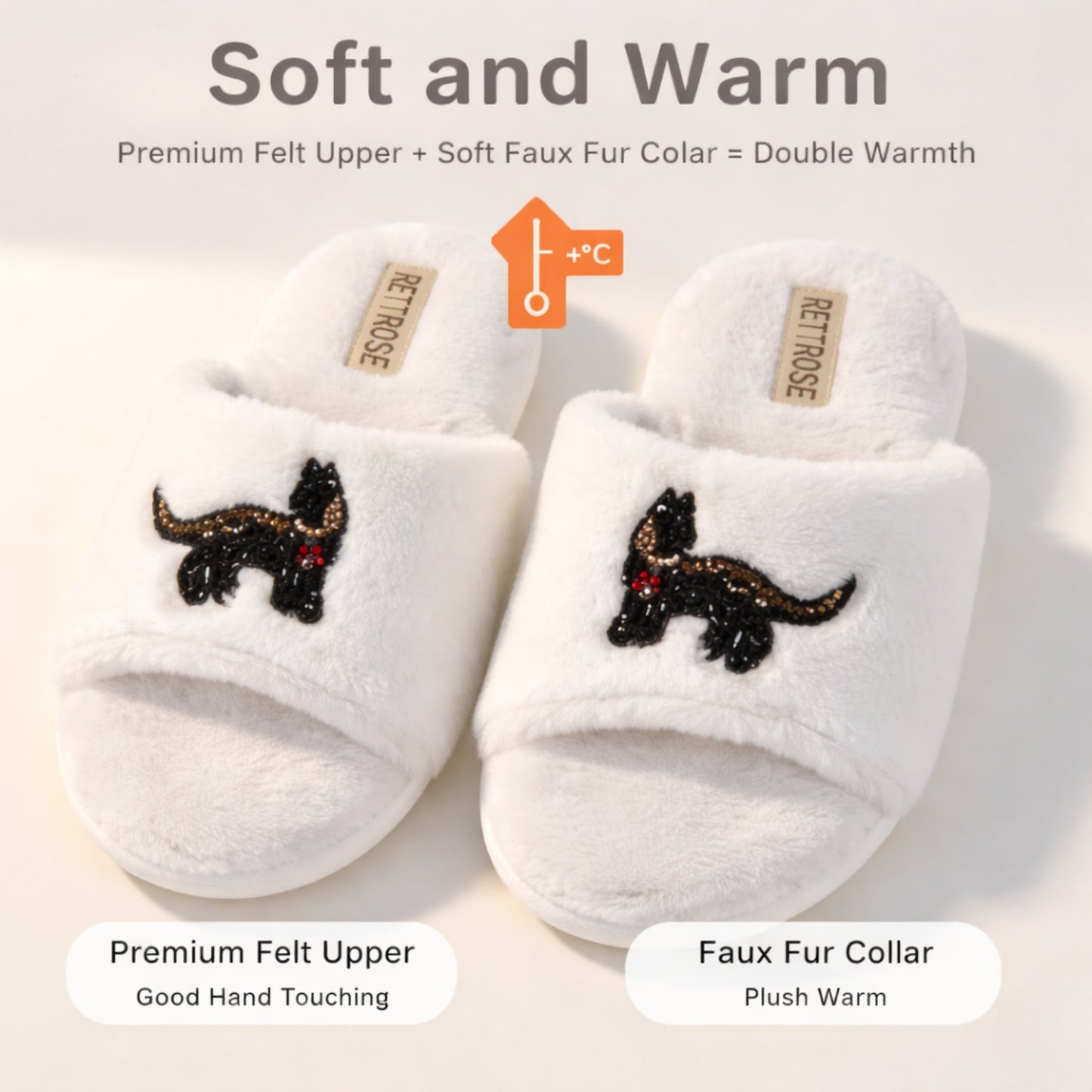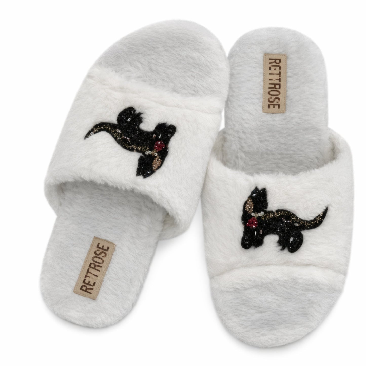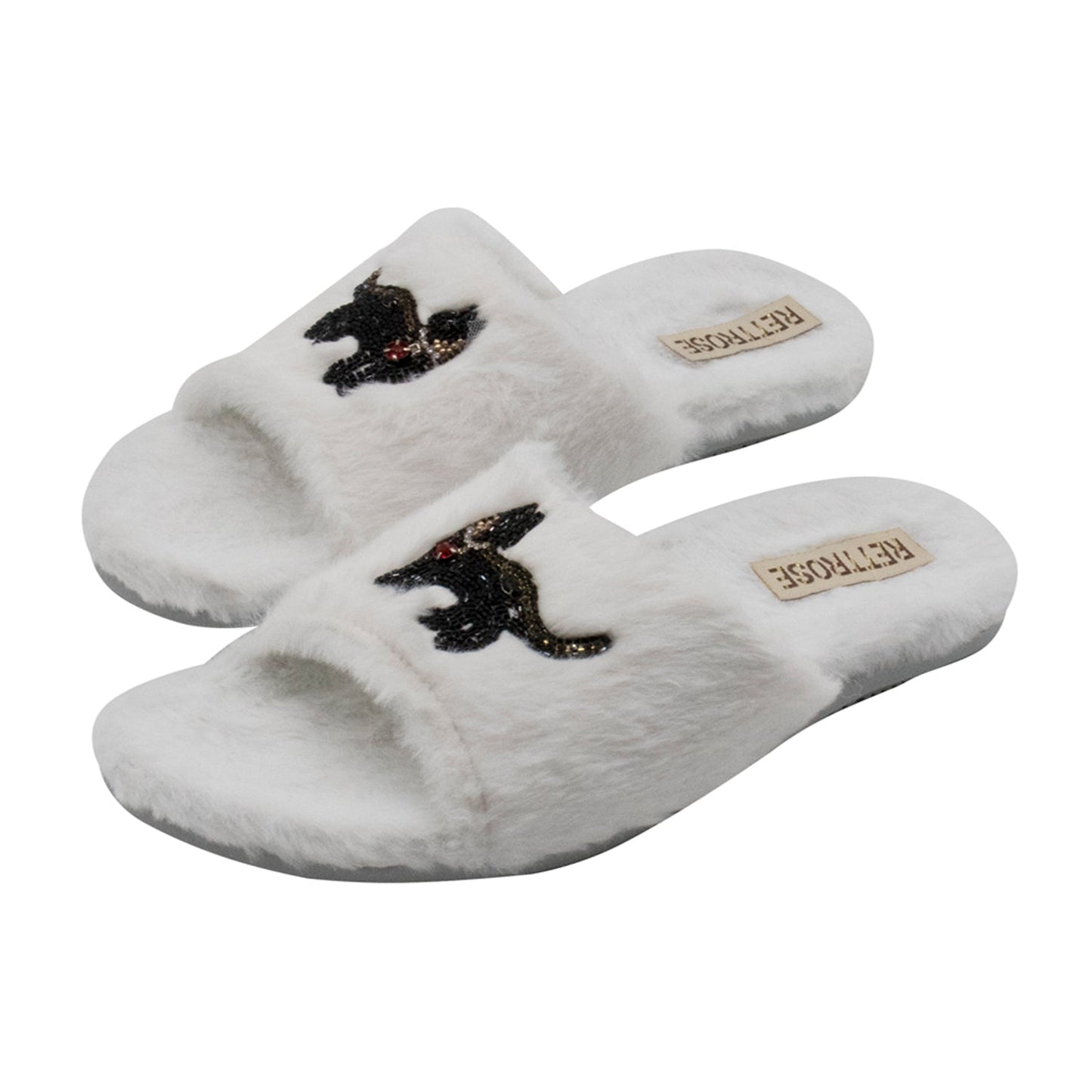 The Callie Cream Luxury Plush Diamanté Embellished Handmade Slipper features a heavy plush faux fur fabrication with a hand embellished cat appliqué featuring a variety of luxury dazzling diamanté.