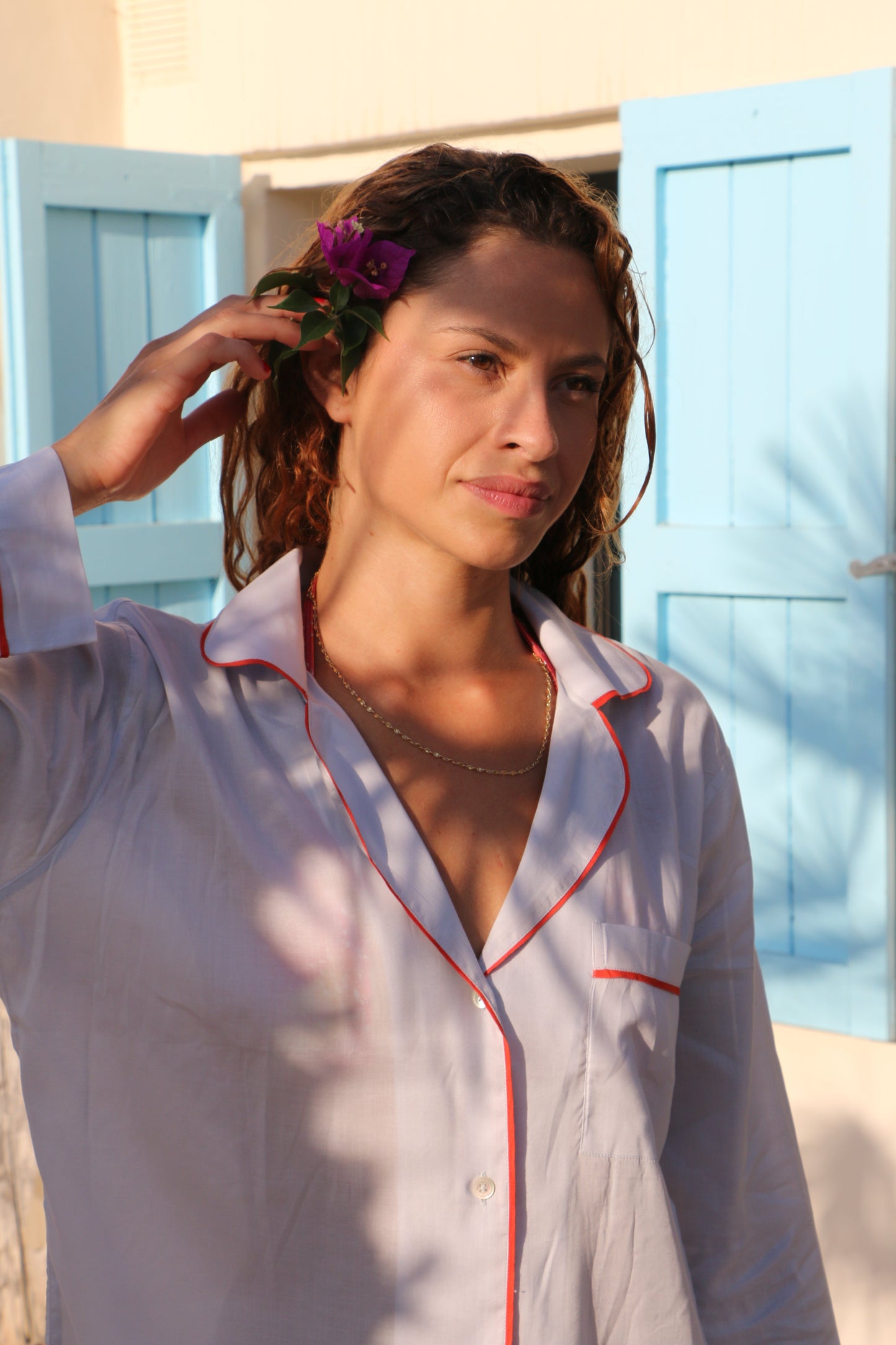 Can Sueños features a delicate, soft blue base paired with bold red piping that adds a touch of elegance and modern refinement. The contrast detail elevates the design, making it both timeless and eye-catching — a truly dreamy combination.