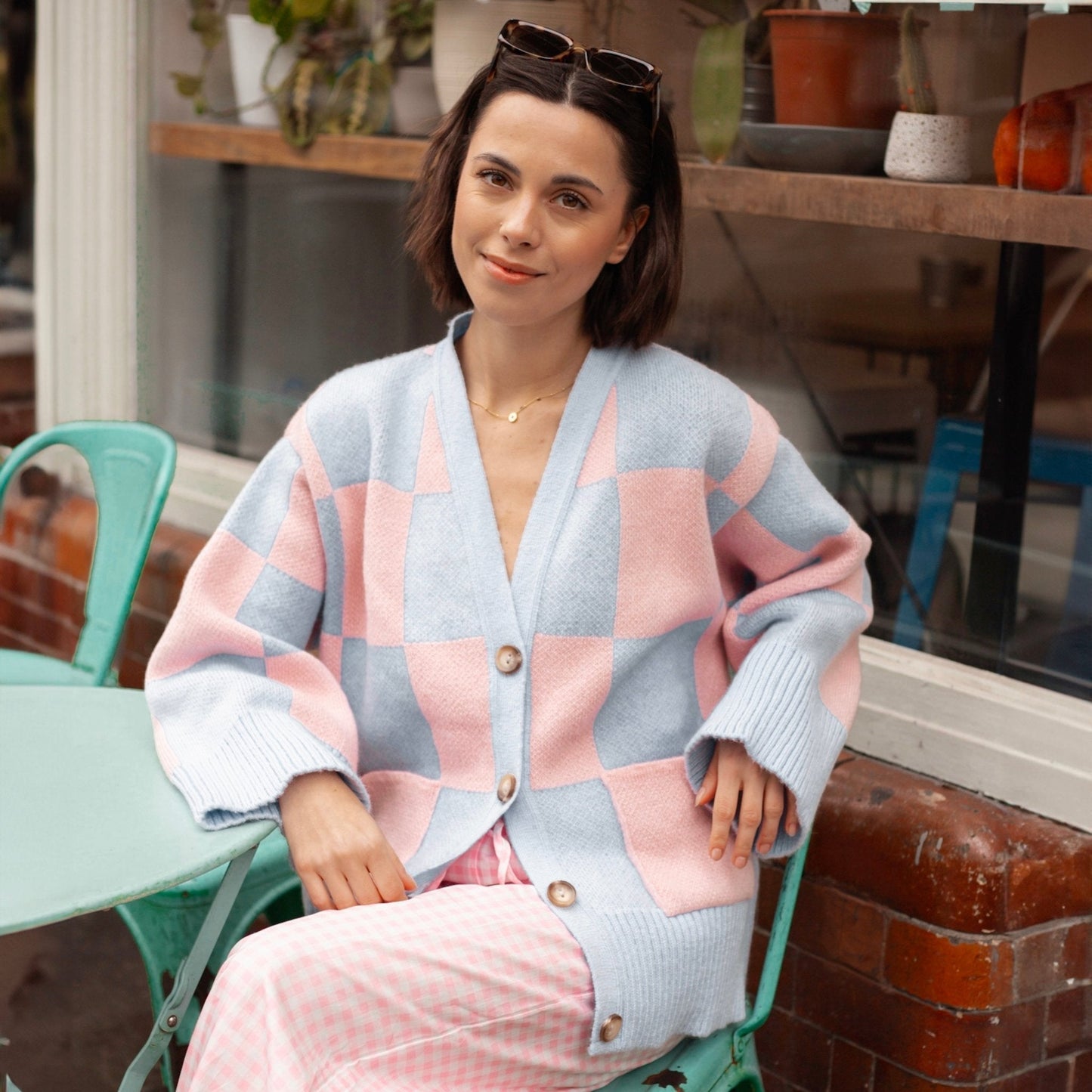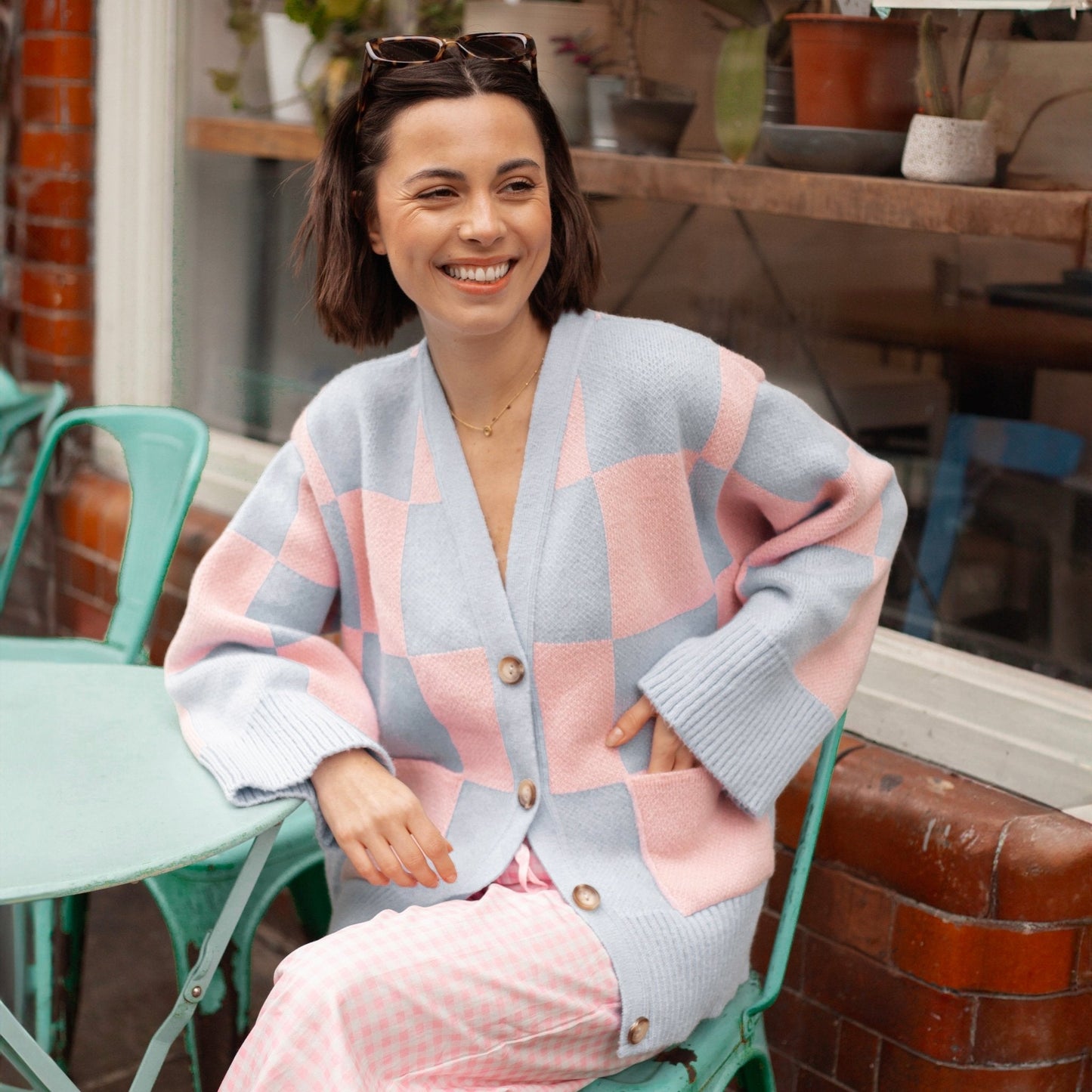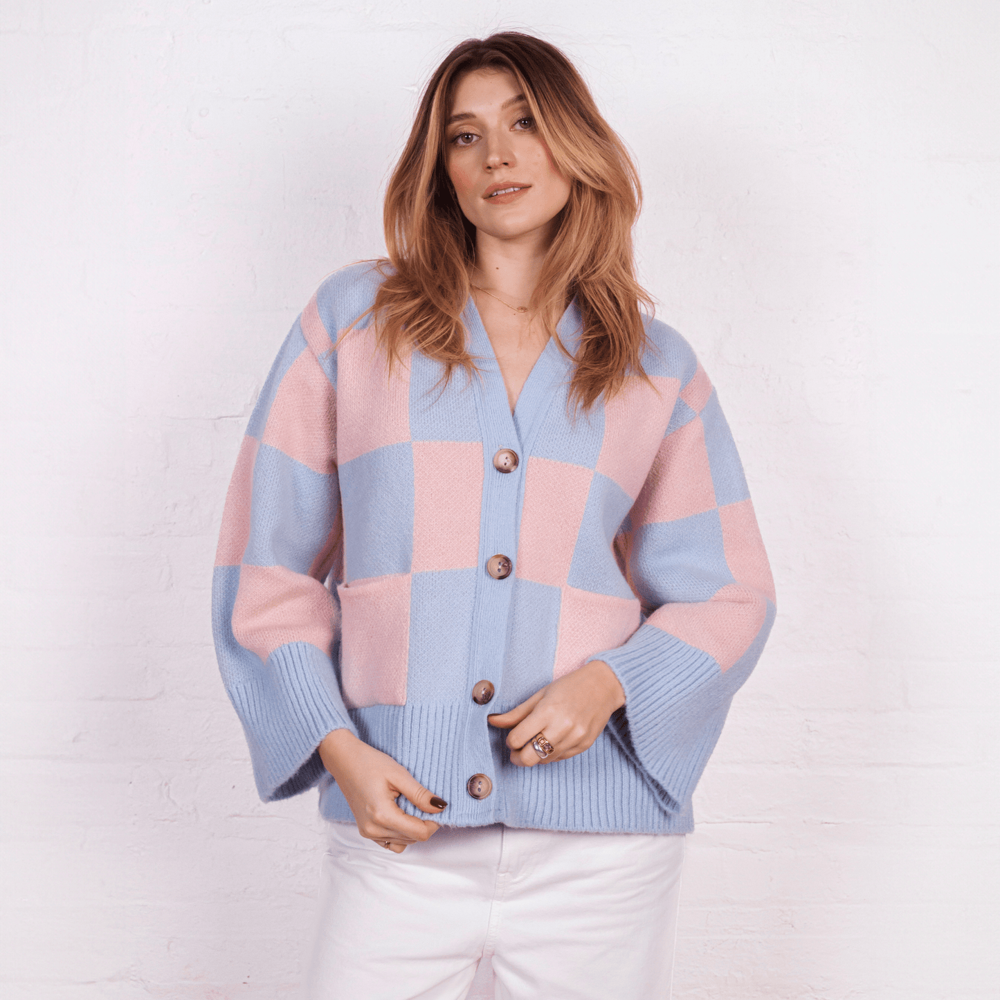 Check this out! The Candice wide sleeve cardigan is taking over, bringing its oversize pink & blue chequered pattern to the front and centre of your wardrobe as an absolute attention stealer!