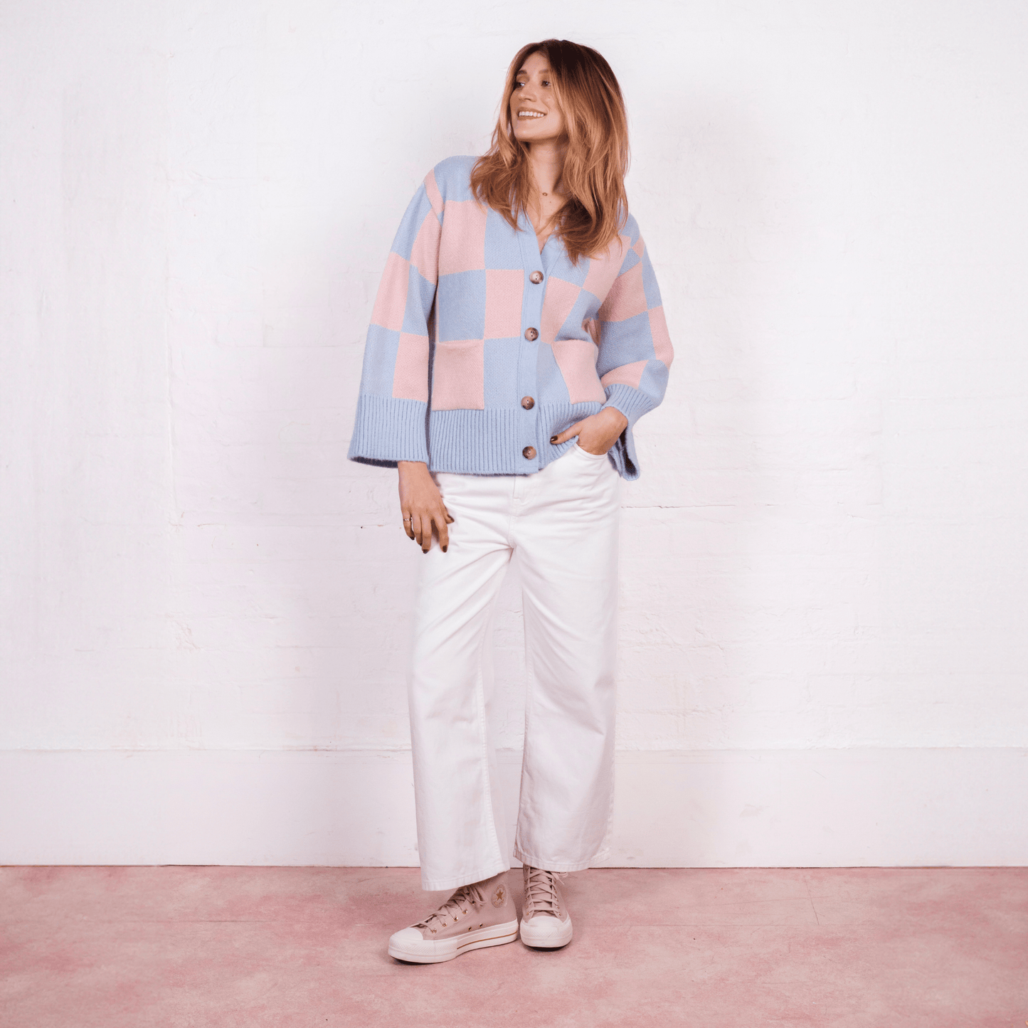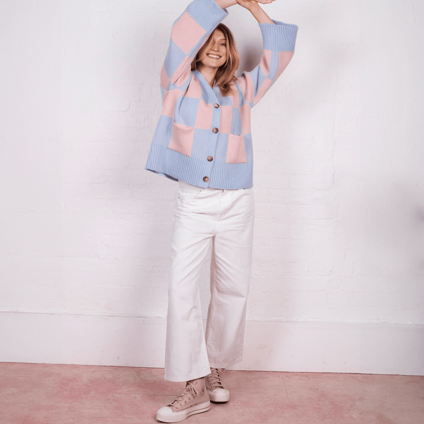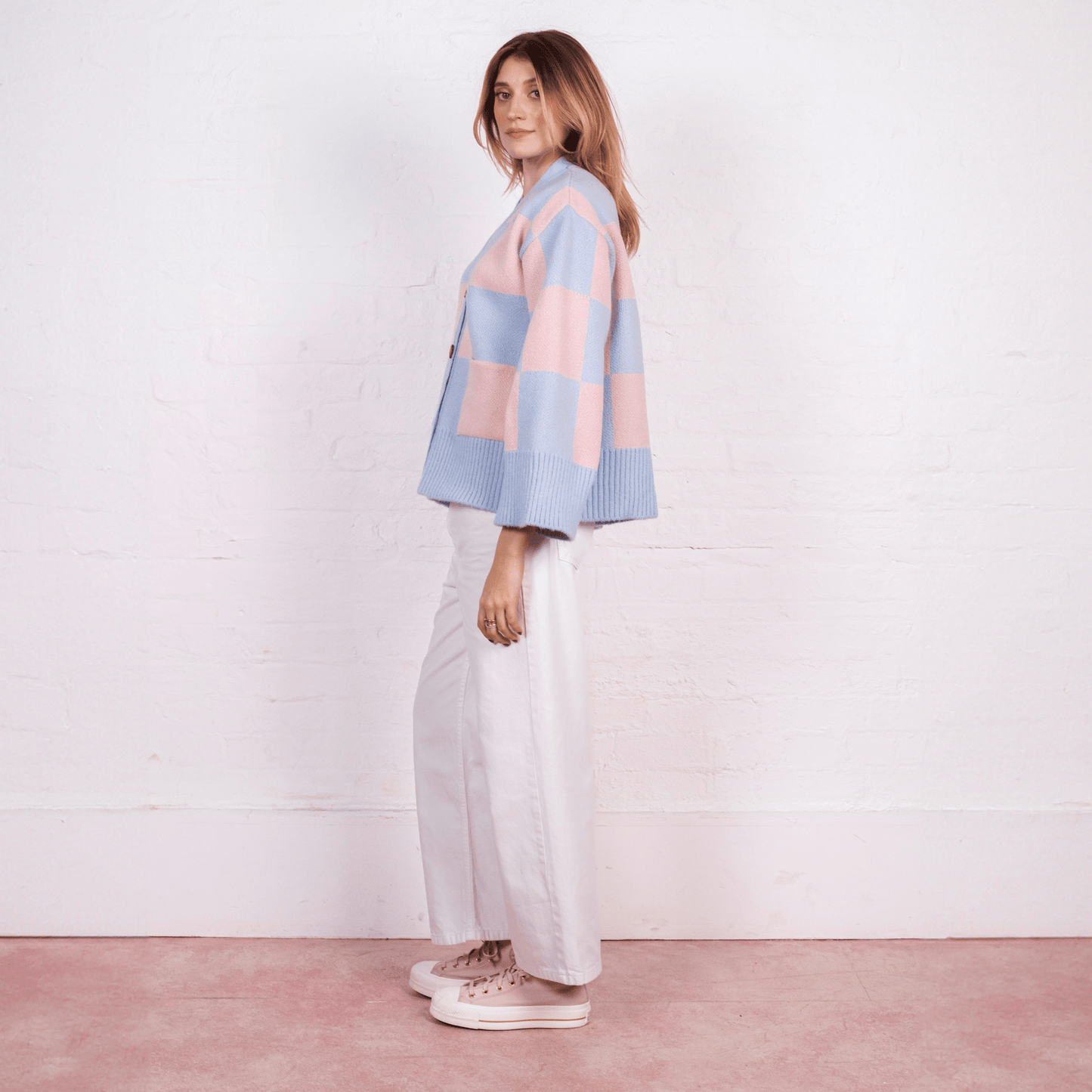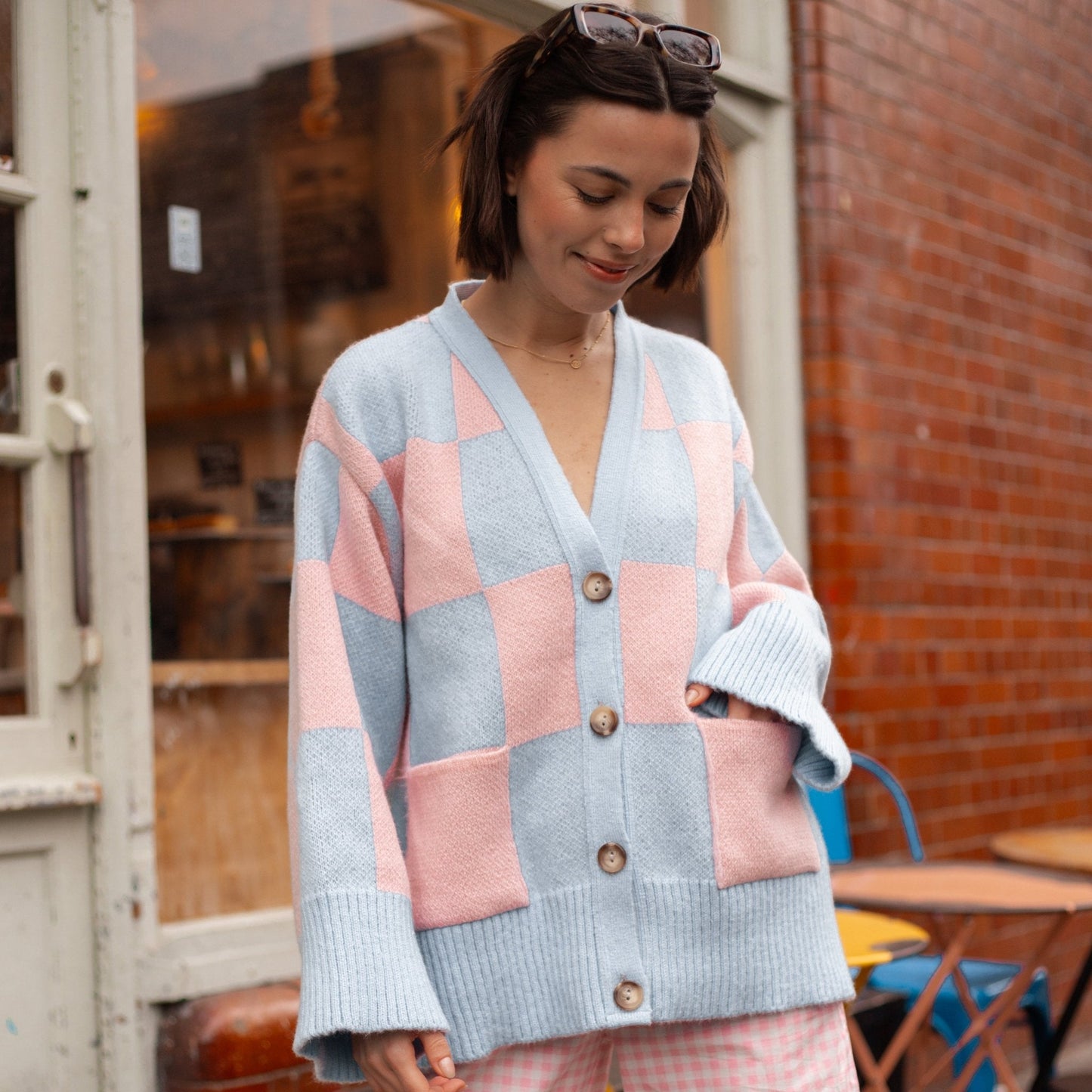 Check this out! The Candice wide sleeve cardigan is taking over, bringing its oversize pink & blue chequered pattern to the front and centre of your wardrobe as an absolute attention stealer!