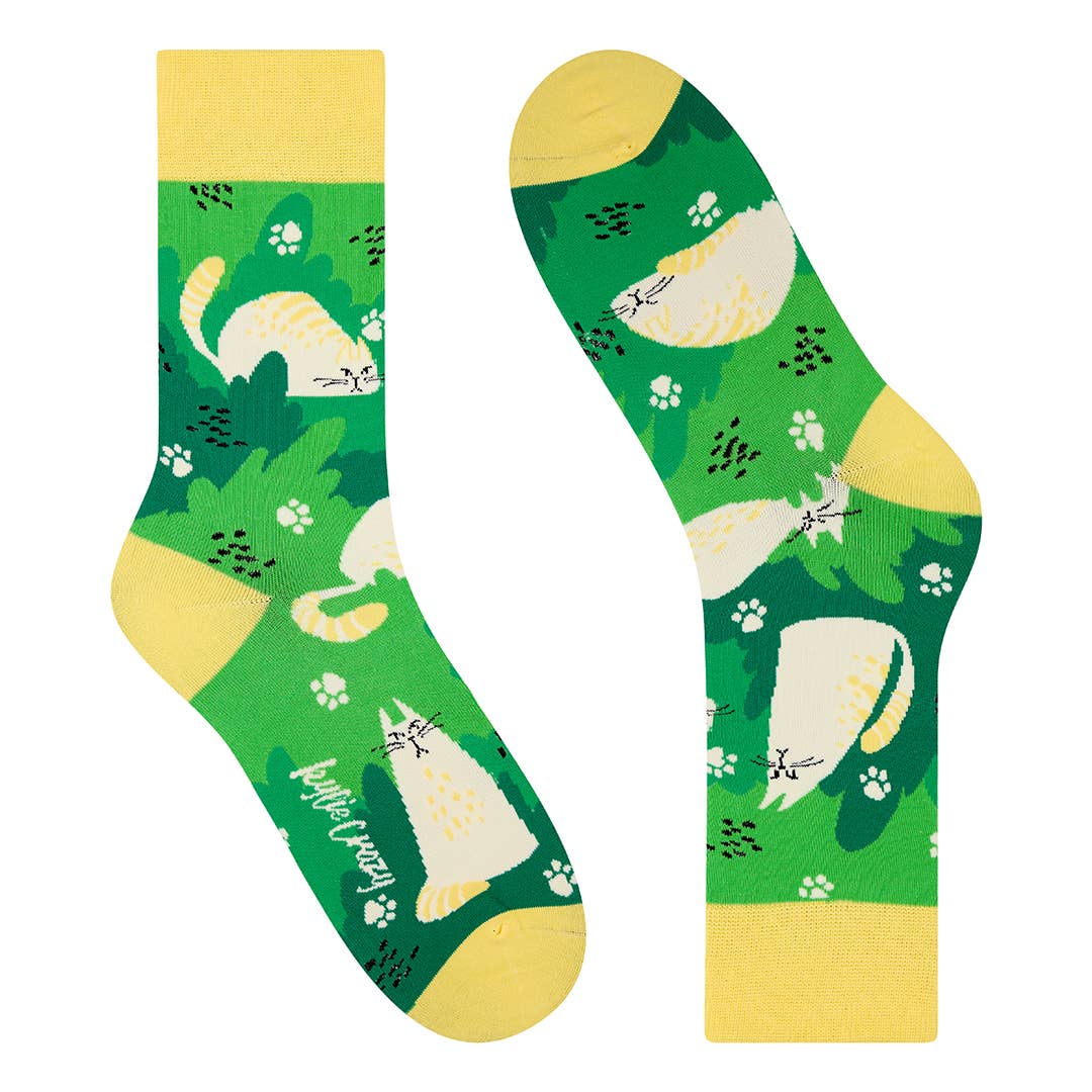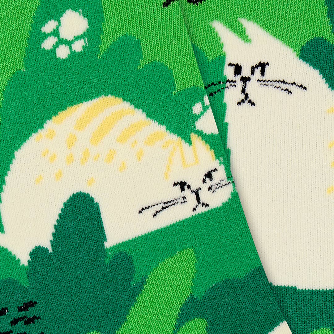 Lazy cat? Jungle vibes? These socks say “I nap, therefore I am.” With sneaky white kitties peeking through bold green foliage and tiptoeing across sunny yellow toes, this pair is for anyone who likes their wild side with a side of sass.