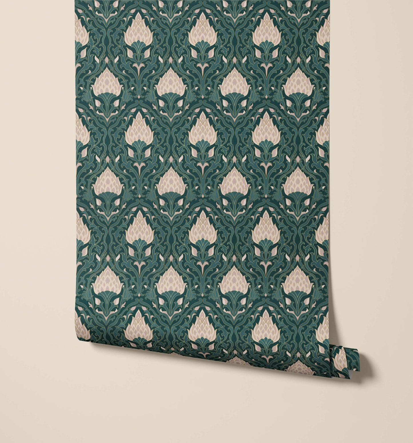 The arts & crafts lotus wallpaper draws inspiration from the timeless elegance of the Arts and Crafts movement, featuring a beautifully detailed lotus motif in a repeating pattern that exudes natural grace. Each lotus flower, with its layered petals and soft curves, is framed by intricate swirling foliage that adds depth and richness to the design. The balance between the bold floral elements and the flowing, organic forms creates a harmonious and refined composition. This wallpaper brings a sense of handcrafted artistry to your space, reflecting the movement's celebration of nature and craftsmanship. Ideal for adding a touch of vintage charm and sophistication to interiors, the arts & crafts lotus wallpaper is perfect for those who appreciate intricate, nature-inspired designs that offer both visual interest and timeless beauty. This wallpaper transforms any room into a refined and calming retreat, making it a stunning addition to living rooms, bedrooms, or dining areas.