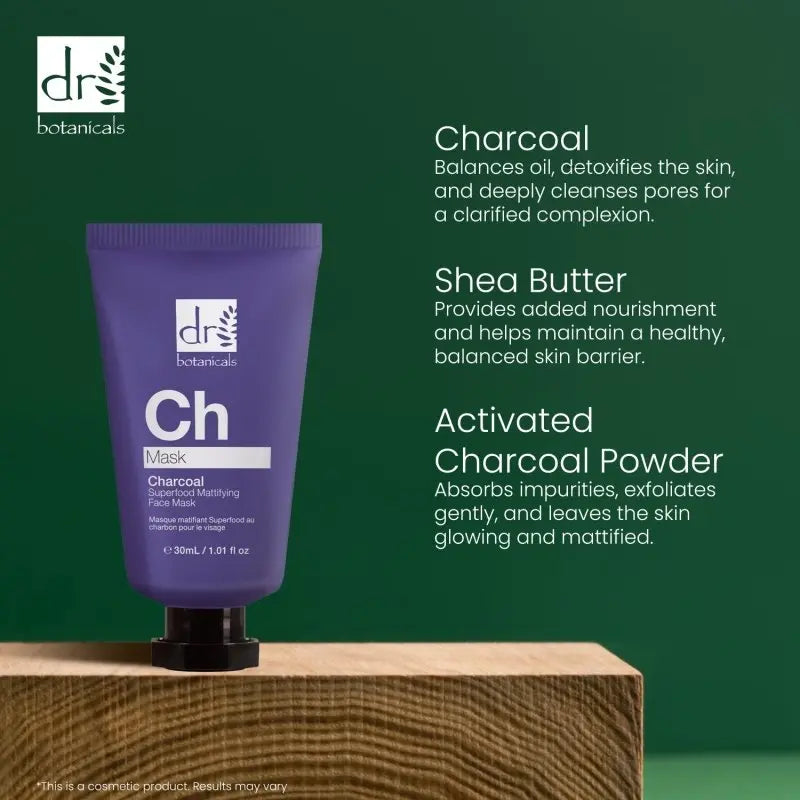 This charcoal superfood mattifying face mask is a powerful and convenient treatment that balances oil, detoxifies the skin, and deeply cleanses pores for a clarified complexion. With its creamy texture and activated charcoal powder, it absorbs impurities, exfoliates gently, and leaves the skin glowing and mattified. Formulated with shea butter for added nourishment and suitable for all skin types, this mask is the perfect choice for achieving an instant glow and maintaining a healthy, balanced skin barrier.