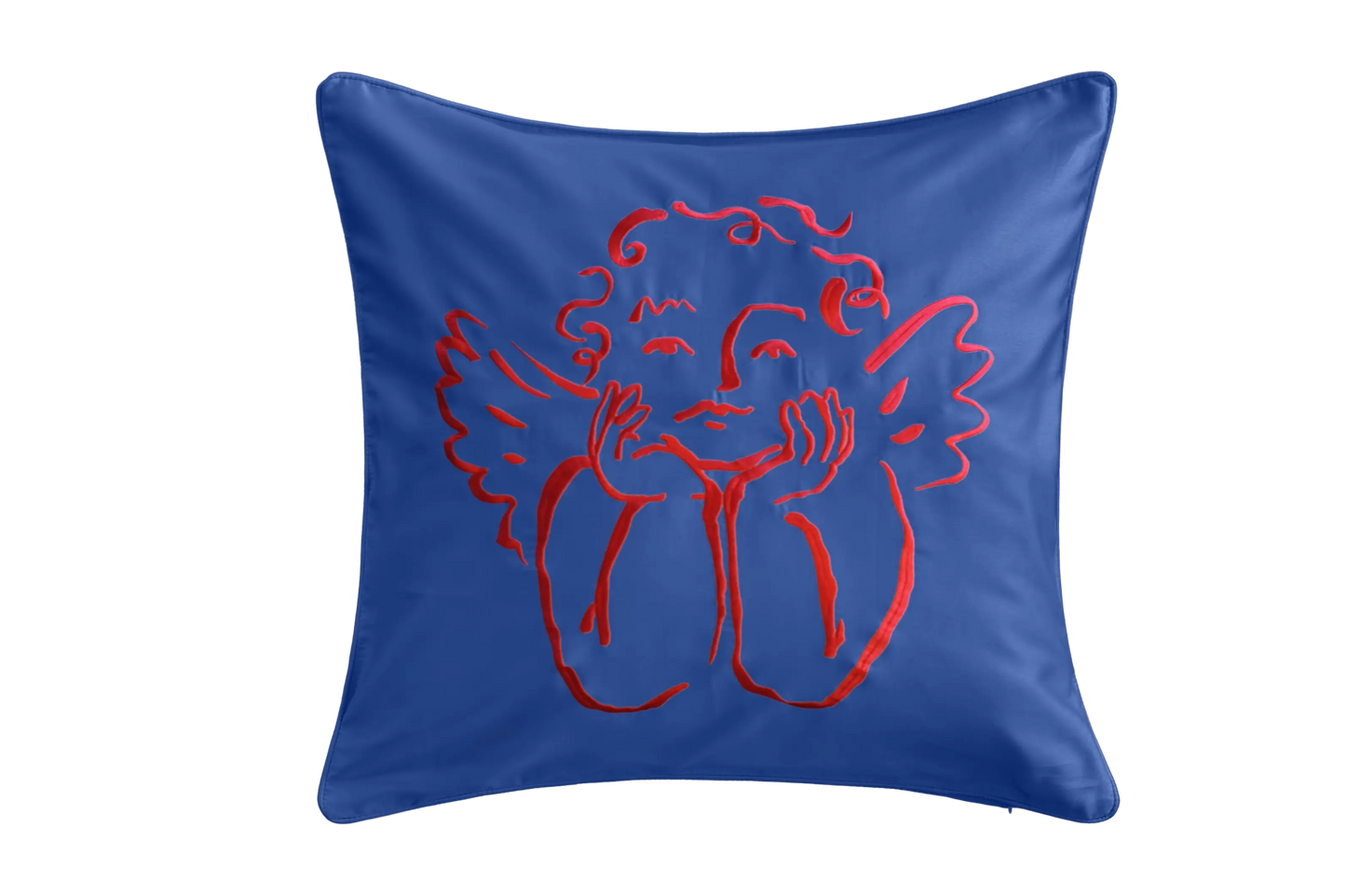 This cushion cover features the signature cheeky cherub, embroidered in ruby red onto rich hot pink sateen. The result is bold, romantic, and joyfully playful — a statement piece that adds colour, flirtation, and whimsy to any bedroom or lounge space.