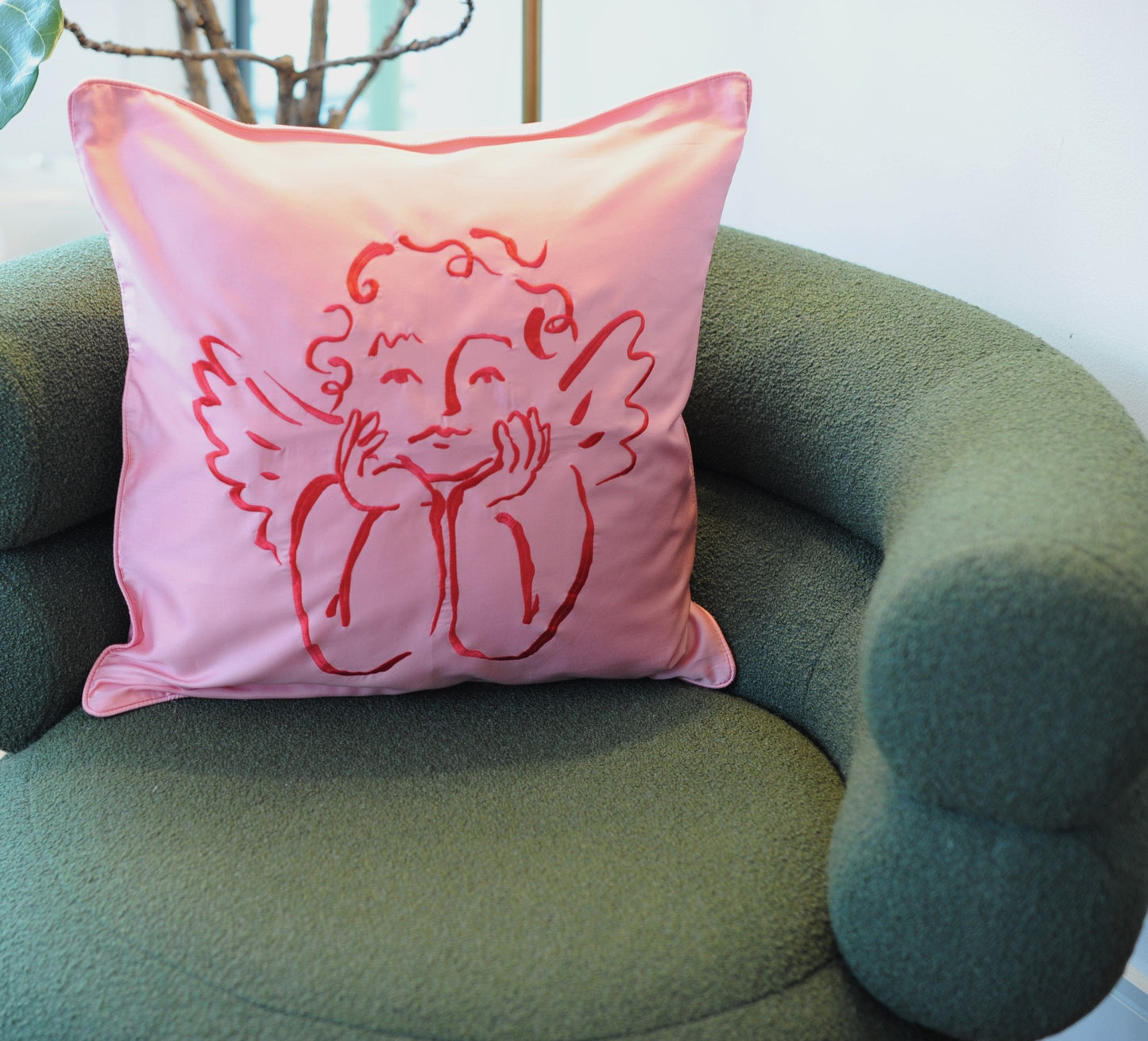 Each cushion case features a "cheeky cherub" which has been hand-illustrated by UK Artist & Illustrator Olivia using Indian Inks, then digitally embroidered in ruby red onto buttery soft, rich cotton "hot pink" sateen.