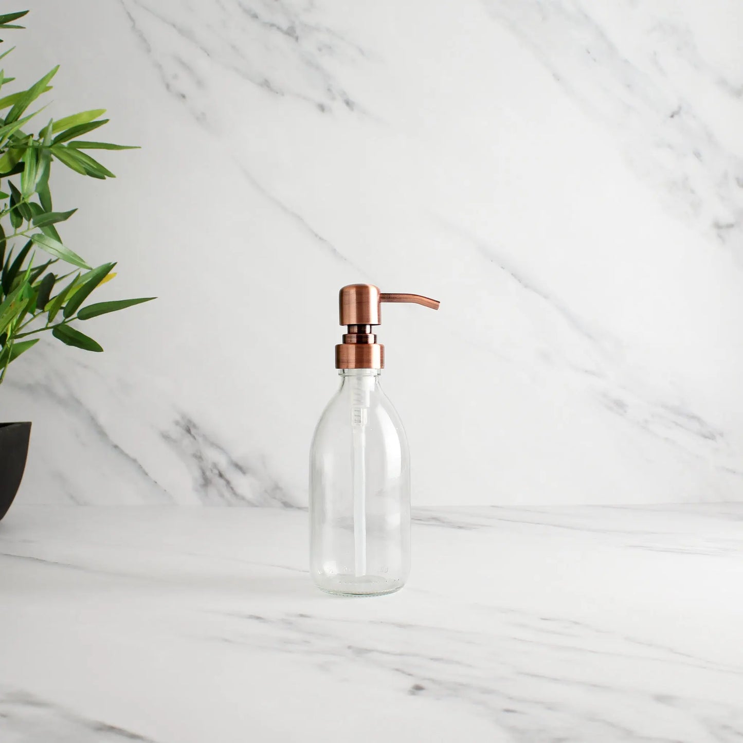 Clear Glass Dispenser Bottle With Rose Gold Pump