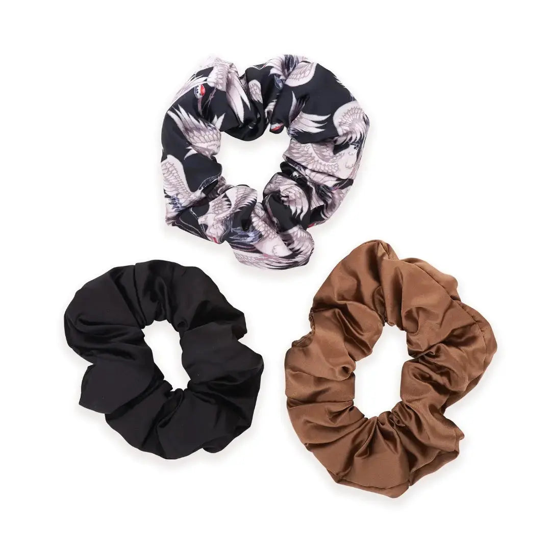 Bring understated elegance to your hair routine with the Cloud Satin Scrunchie Set in Moonlit Mocha. This sophisticated trio includes one scrunchie in the graceful Moonlit Cranes print, one in rich mocha satin, and one in classic black — creating a timeless set perfect for everyday wear or evening styling.