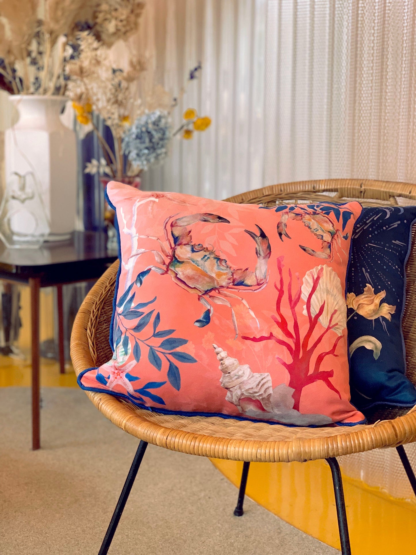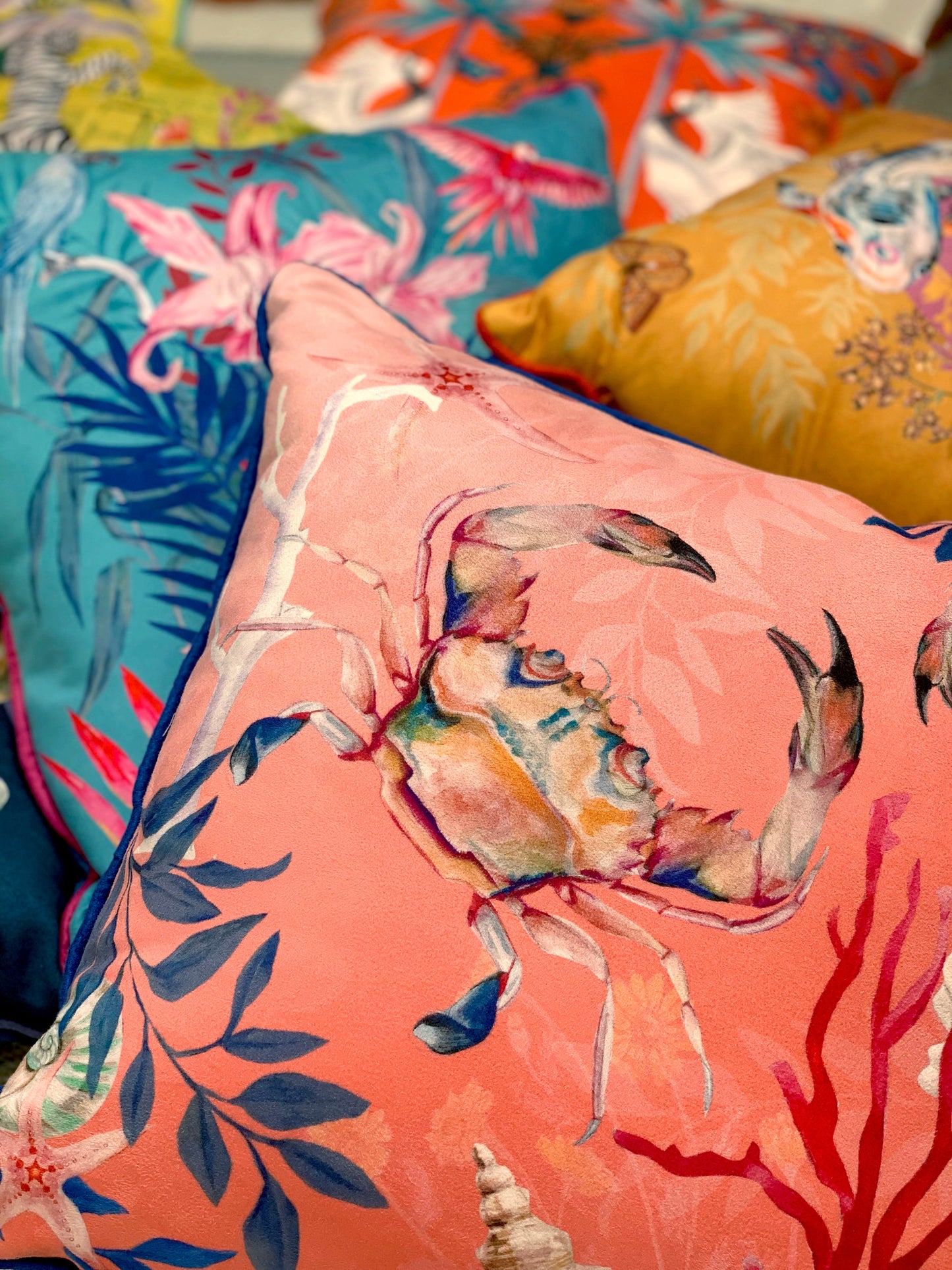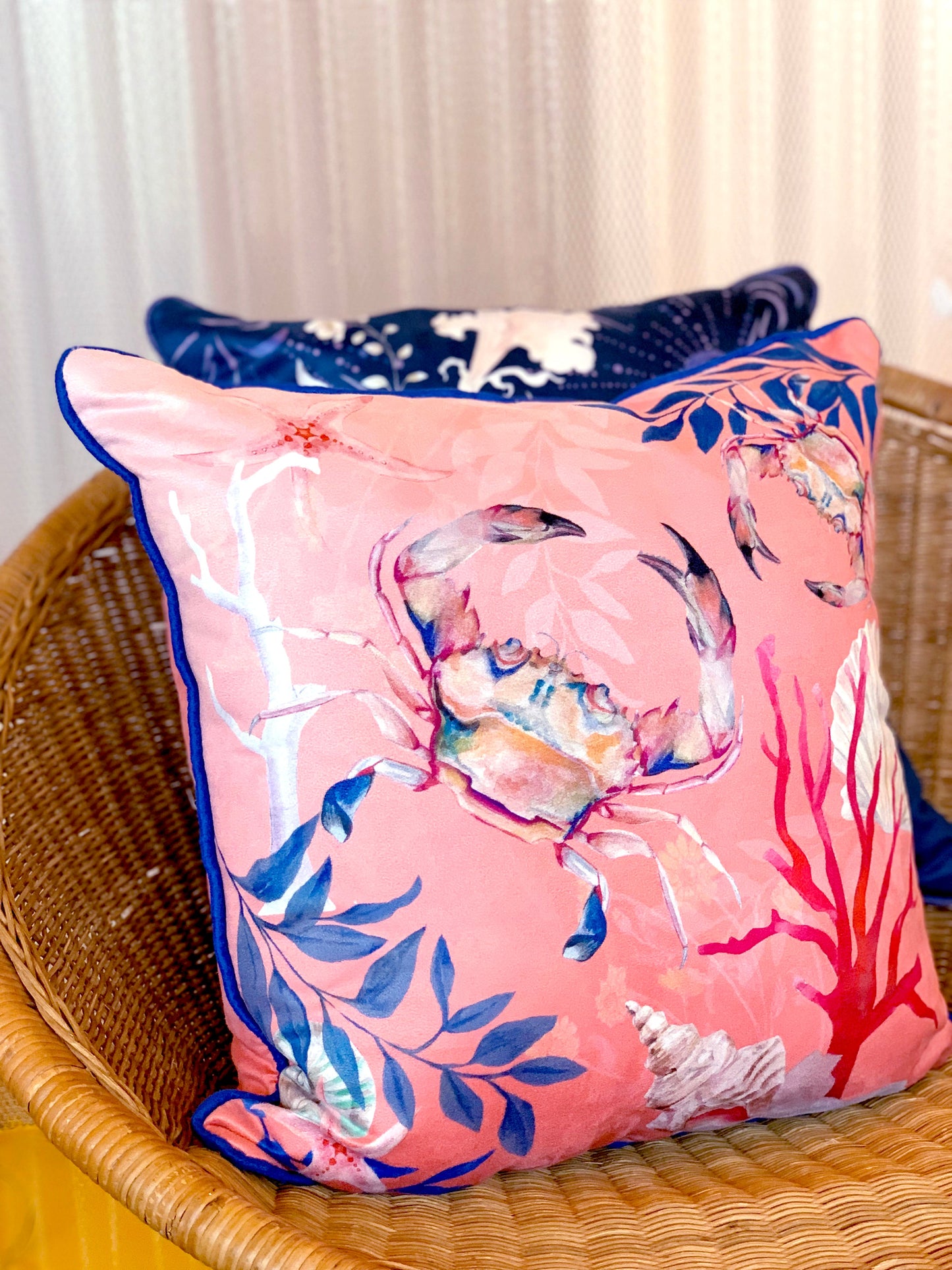 A gorgeous cushion in coral pink, featuring watercolour painted corals, shells and colourful crabs. This seashore inspired design has been made from a vegan friendly fabric with the sumptuous feel of suede, the vibrant artwork is water colour painted then printed with perfect clarity using an ink jet printer.