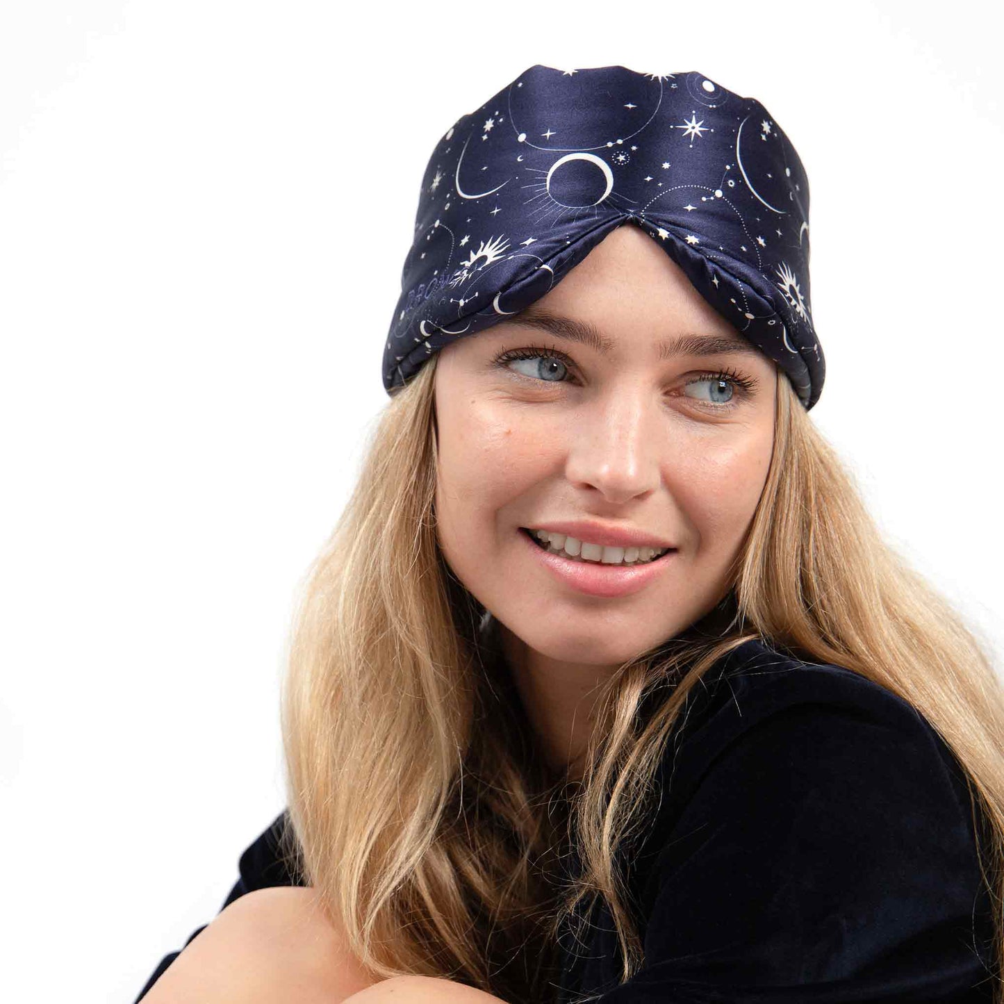 Our Cosmic Energy silk mask is a revolution in rest. Clinically proven to enhance your skin naturally while you sleep. The fully adjustable, blackout design provides the ultimate escape for weary eyes. Drowsy delivers uninterrupted, restorative beauty sleep every night. Wake up every day refreshed and glowing. 100% washable deep blue eye mask with luxury night-sky pattern.