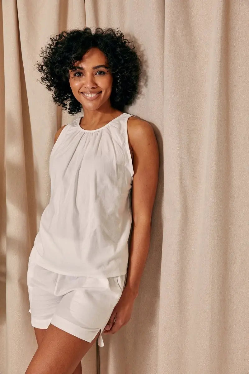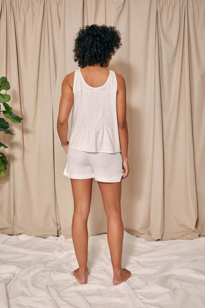 Cotton Modal Vest Short Set – effortlessly soft and stylish, this set is crafted from breathable BCI cotton modal for a lightweight, silky feel. The relaxed-fit vest top features a pretty ruched elasticated back for a feminine touch and a hip-length cut for easy wear. The regular-length shorts offer a comfortable ruched elasticated waistband and functional pockets, making this the perfect blend of comfort and everyday elegance. Available in Sky, White and Natural.