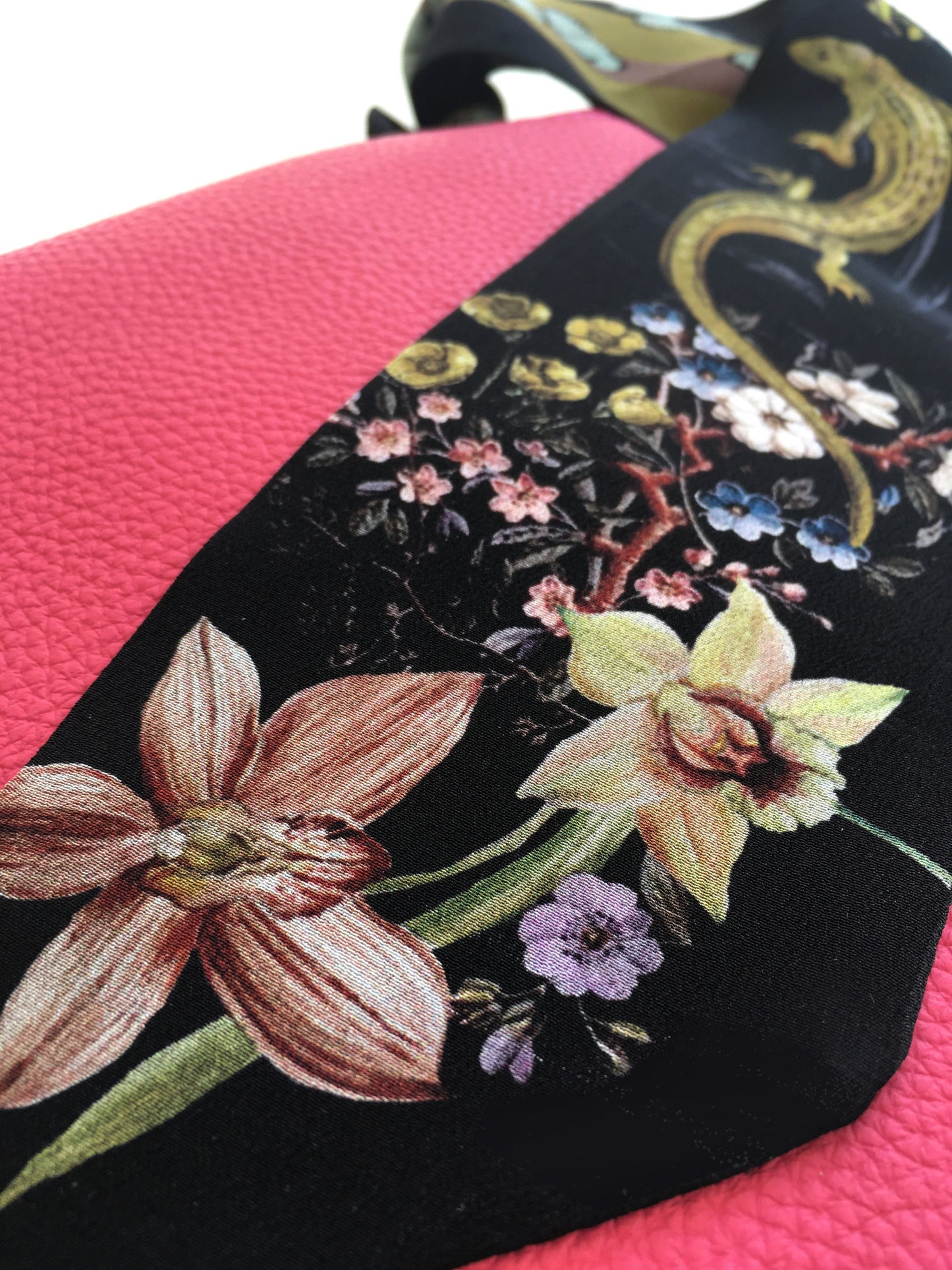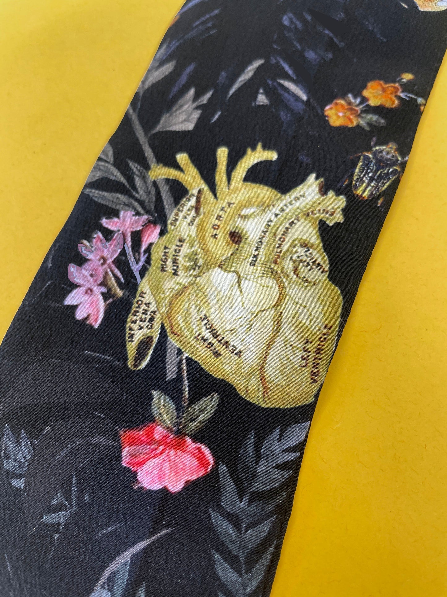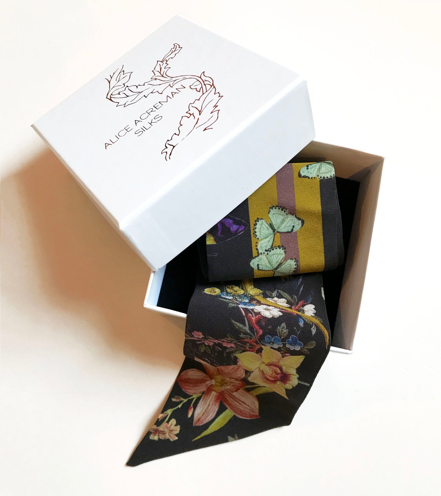 This gorgeous silk accessory, named the 'Skinny Silk' for it's delicate shape is a versatile ribbon of Silk with multiple styling options. Made from beautiful silk crepe and finished with slanted ends, the digitally printed design is a double sided design, both sides featuring Alice's signature, hand painted, botanical style in a palette of vibrant colours. Adapted from the much loved 'Cardiac' large square scarf design, this print features adorable little creatures and botanicals which tell the story of nature protecting the Amazon Rainforest from harm.