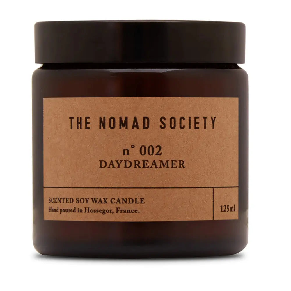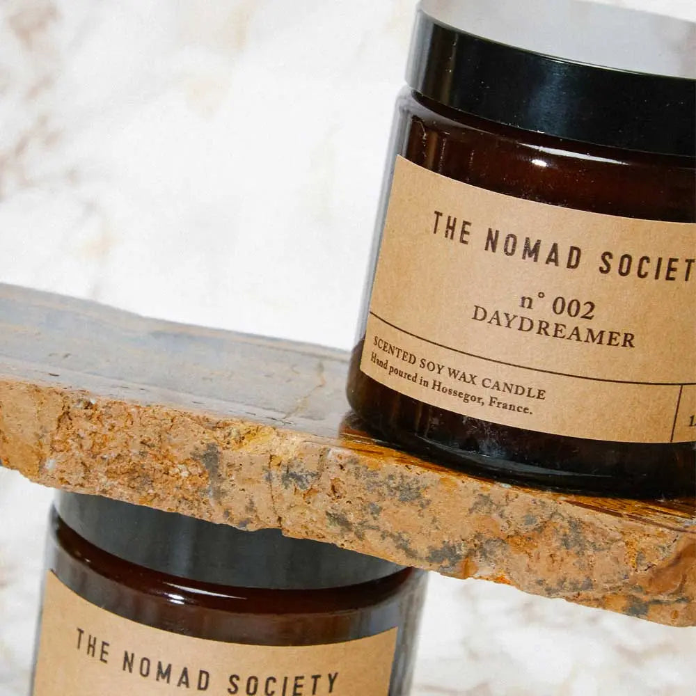 The Nomad Society range of scented soy wax candles are hand poured in Hossegor, France. They feature an amber glass jar, twist on black lid and a natural cotton core wick for a cleaner burn.