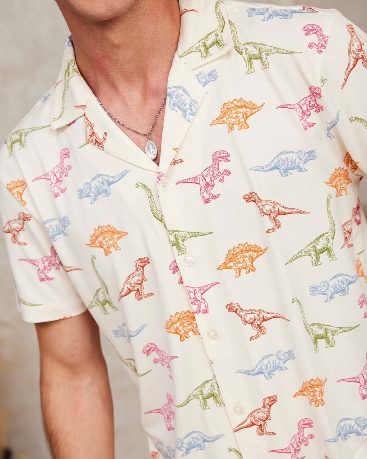 Calling all dinosaur lovers! From t-rex to triceratops, indulge in your inner palaeontologist in these soft recycled jersey short pyjamas. With a short sleeve button up shirt and matching long pyjama bottoms, this easy to wear set is finished with bright orange contrasting piping.