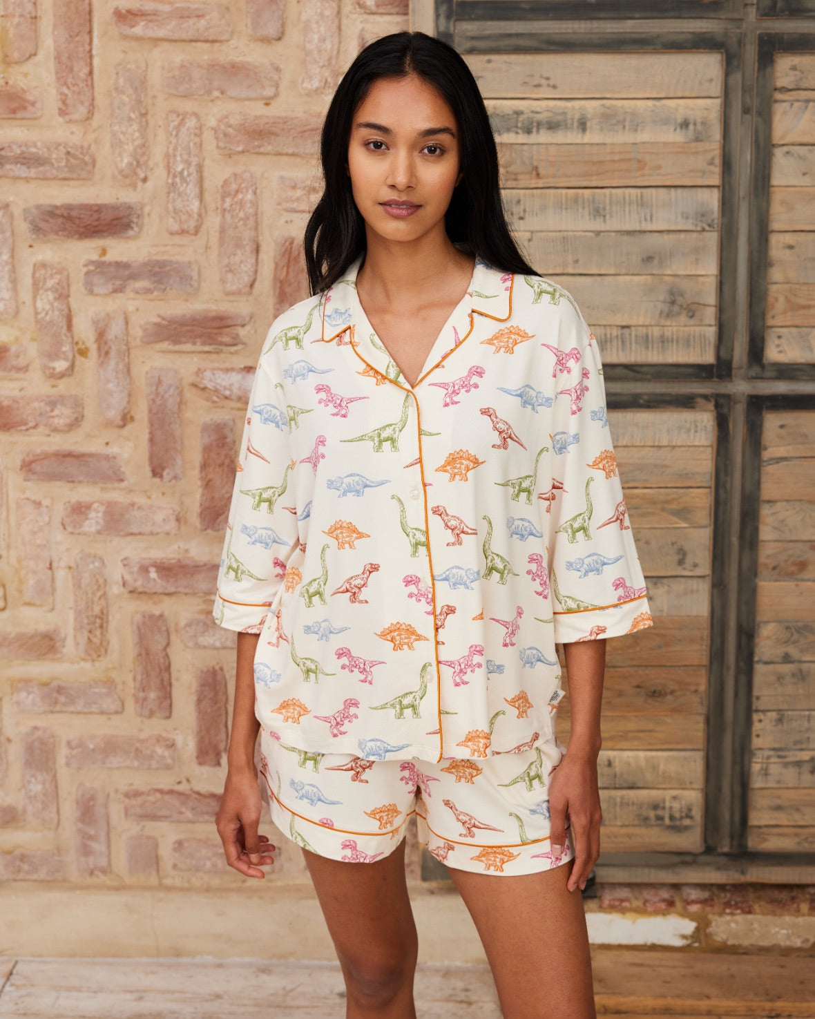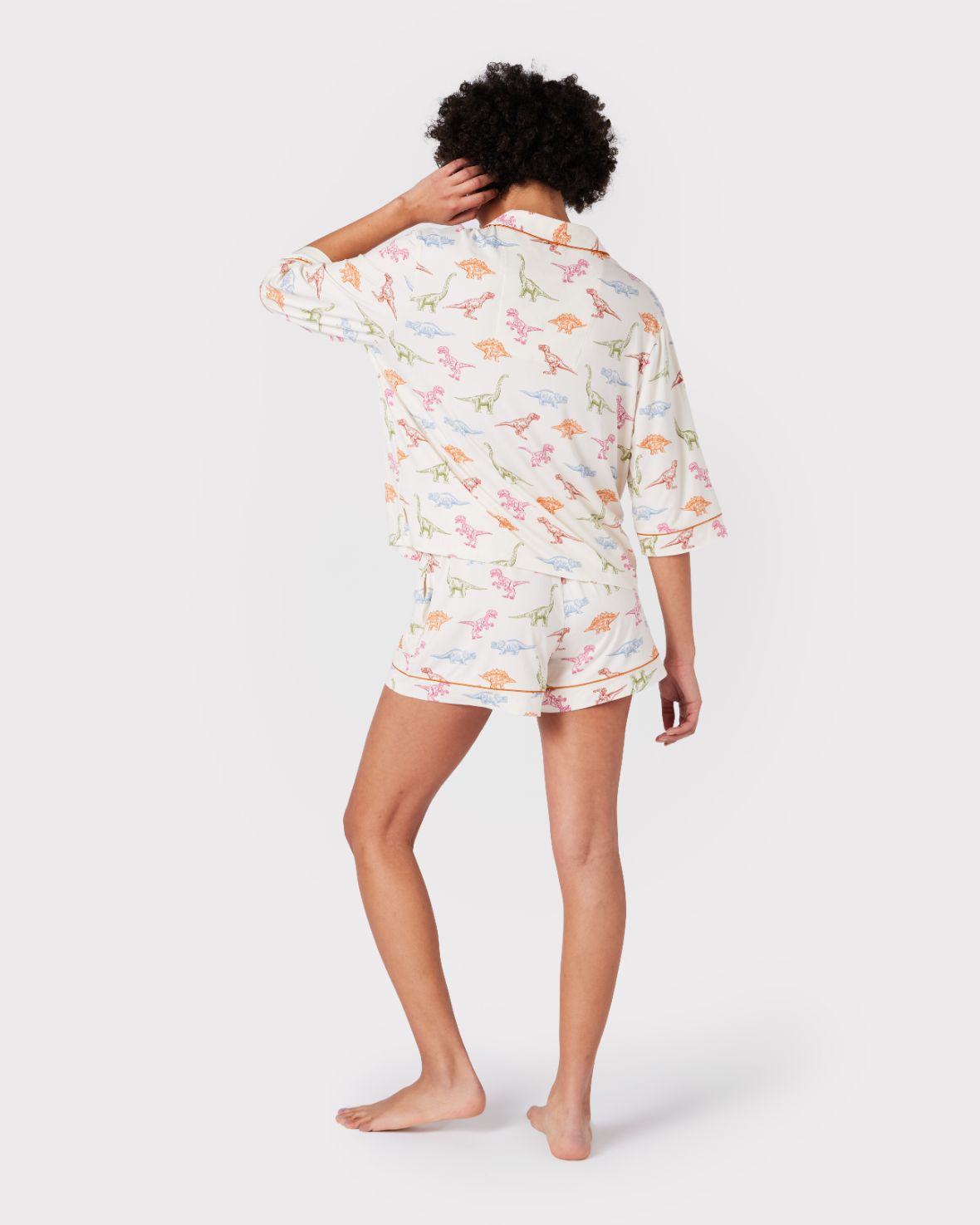 Calling all dinosaur lovers! From t-rex to triceratops, indulge in your inner palaeontologist in these soft recycled jersey short pyjamas. With a 3/4 length sleeve button up shirt and matching shorts, this easy to wear set is finished with a satin ribbon drawstring and contrasting piping.