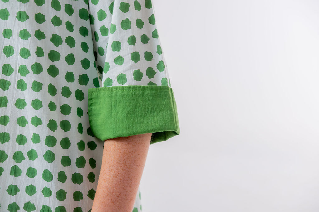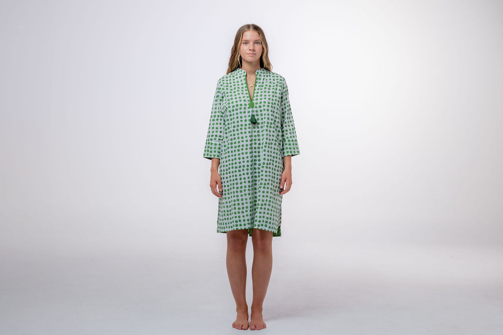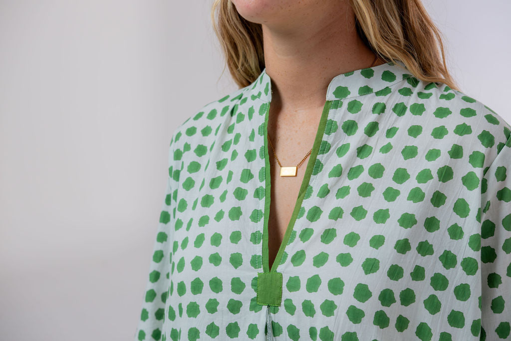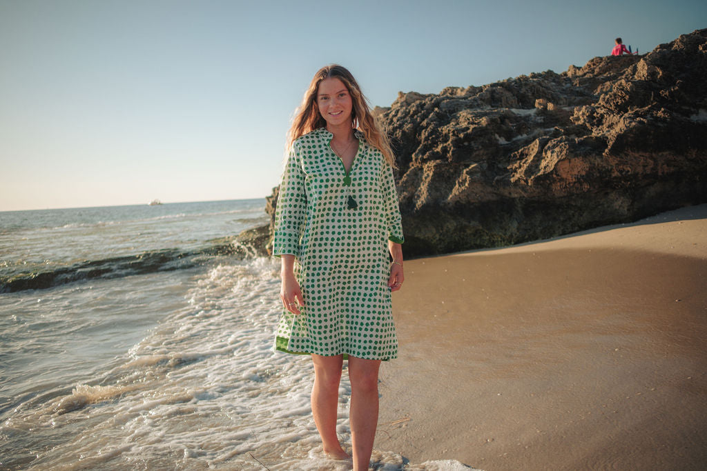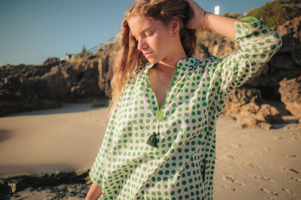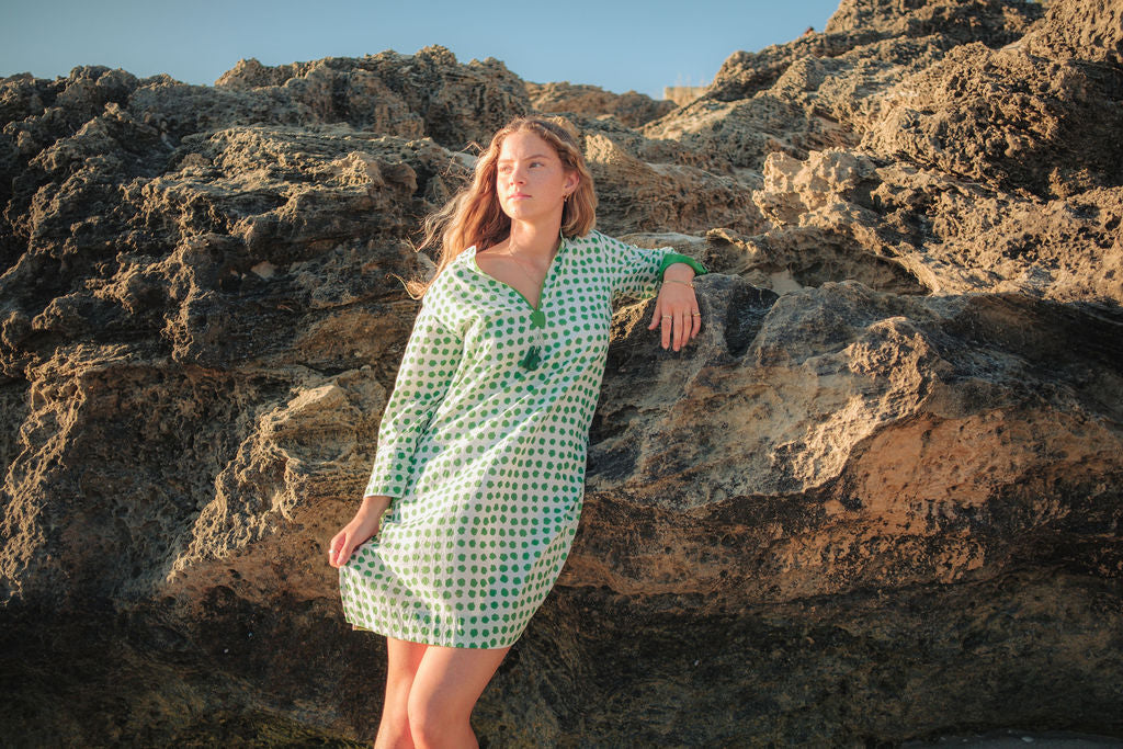 Meet Disha,our lightweight cotton boho Kurti tunic is your effortless go-to, whether you’re strolling on the beach, grabbing a morning coffee, or layering up for a chic, relaxed look. The breathable voile cotton drapes beautifully, keeping you cool and comfortable, while the Moroccan-inspired print with emerald green polka dots adds a playful, stylish touch—because who doesn’t love a hint of polka dot charm?