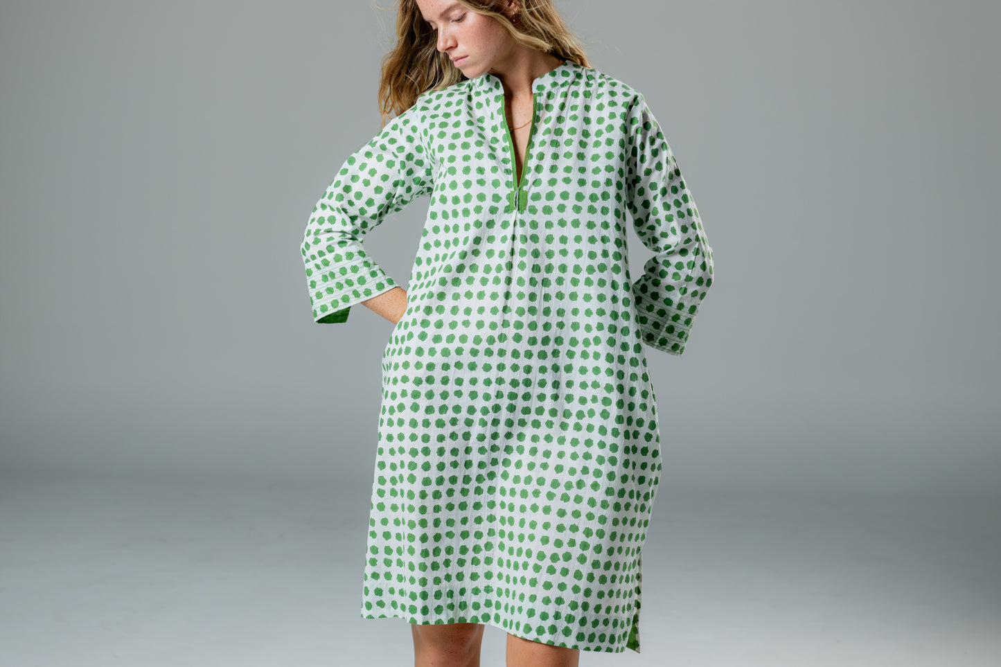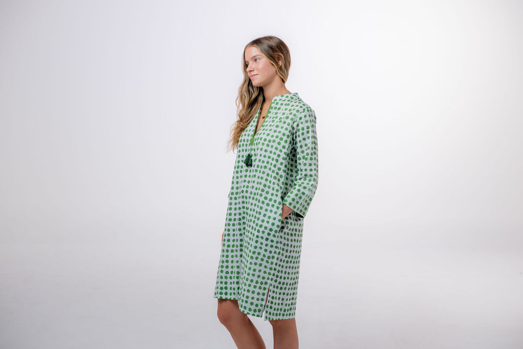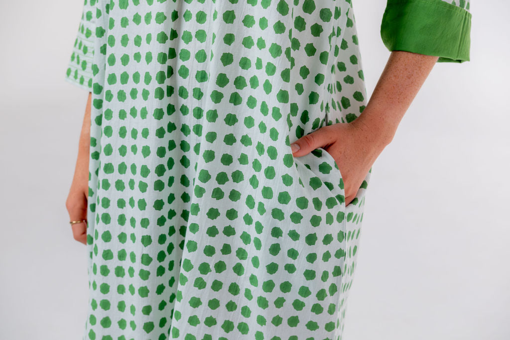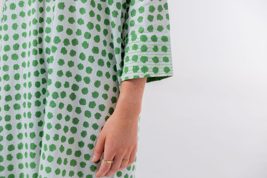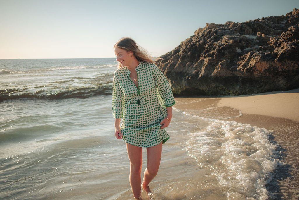 Meet Disha,our lightweight cotton boho Kurti tunic is your effortless go-to, whether you’re strolling on the beach, grabbing a morning coffee, or layering up for a chic, relaxed look. The breathable voile cotton drapes beautifully, keeping you cool and comfortable, while the Moroccan-inspired print with emerald green polka dots adds a playful, stylish touch—because who doesn’t love a hint of polka dot charm?
