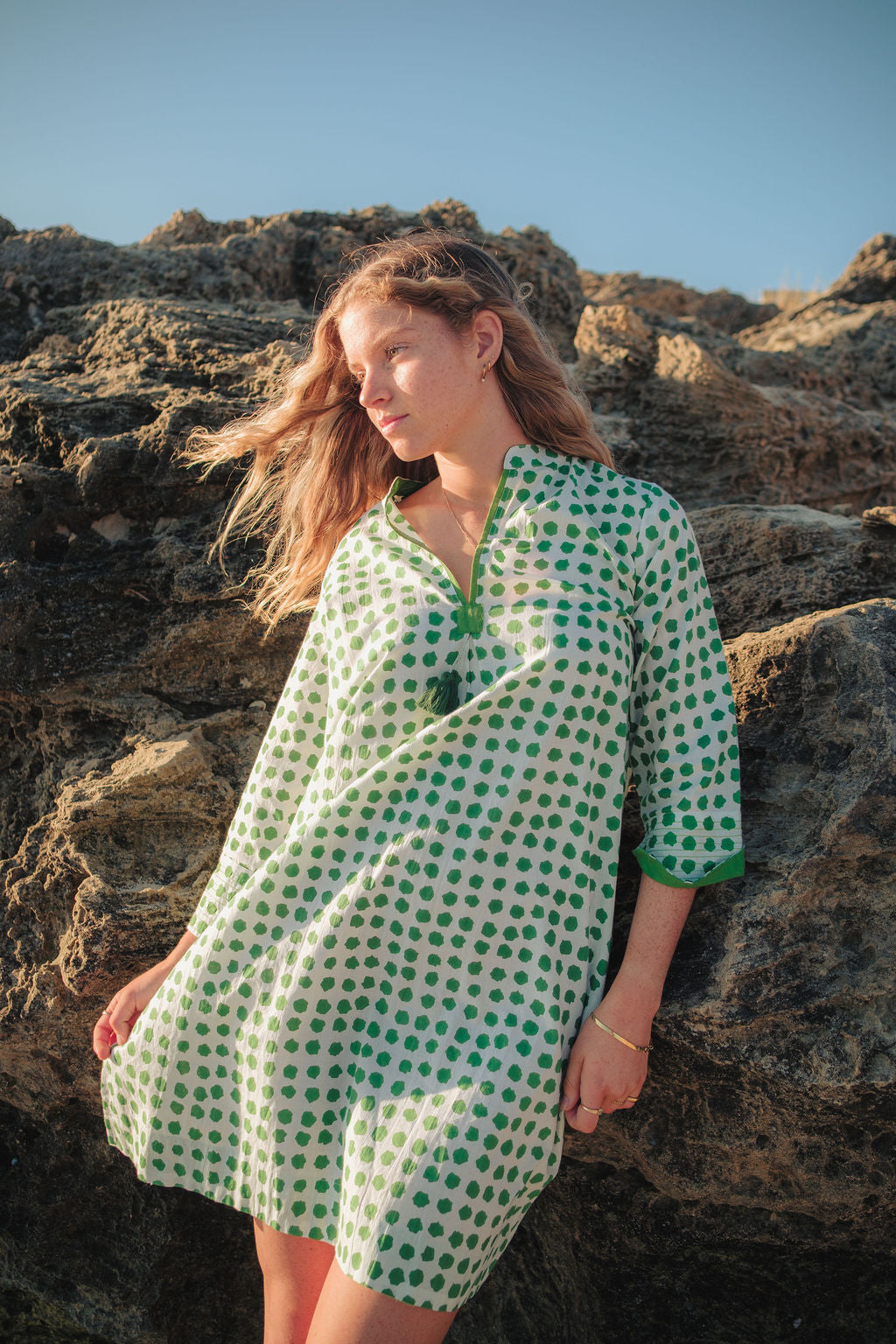The contrasting green tassels bring out its boho elegance, and yes—it has a pocket (because we all love a practical detail!). Pair it with matte gold accessories, just like our model, for an effortlessly put-together vibe, whether you go barefoot in the sand or step out in your fave gladiator sandals.