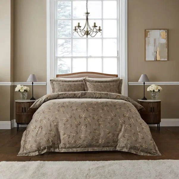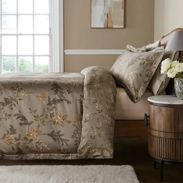 Transform your bedroom into a serene sanctuary with the Dorma Moonlight Blossom Panel Duvet and Pillowcase Set. Crafted from 100% cotton sateen with a luxurious 300 thread count, this bedding set delivers supreme softness, a subtle sheen, and long-lasting quality. Its rich, swirling leaf motif and embroidered gold panel borders exude refined opulence, while the reverse features a winding leaf design for a beautiful alternative look.