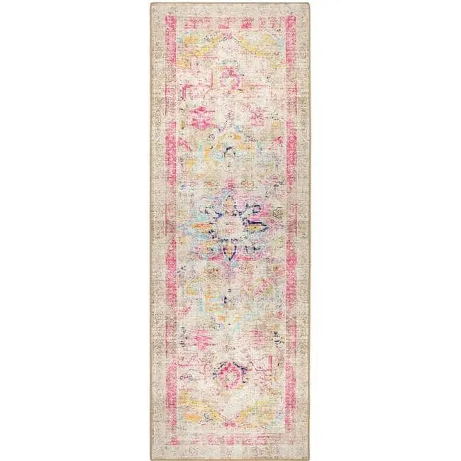 The Eco-Washable Multicolour Rug in Vintage Design blends timeless elegance with modern convenience. This rug showcases a classic medallion design with a vintage, worn effect, enhanced by bold and vibrant colours. The beige background is complemented by vibrant shades of pink, yellow, orange, and blue, creating a fresh and stylish appearance. Finished with beige tape, this design suits any interior, from contemporary homes to classic spaces.