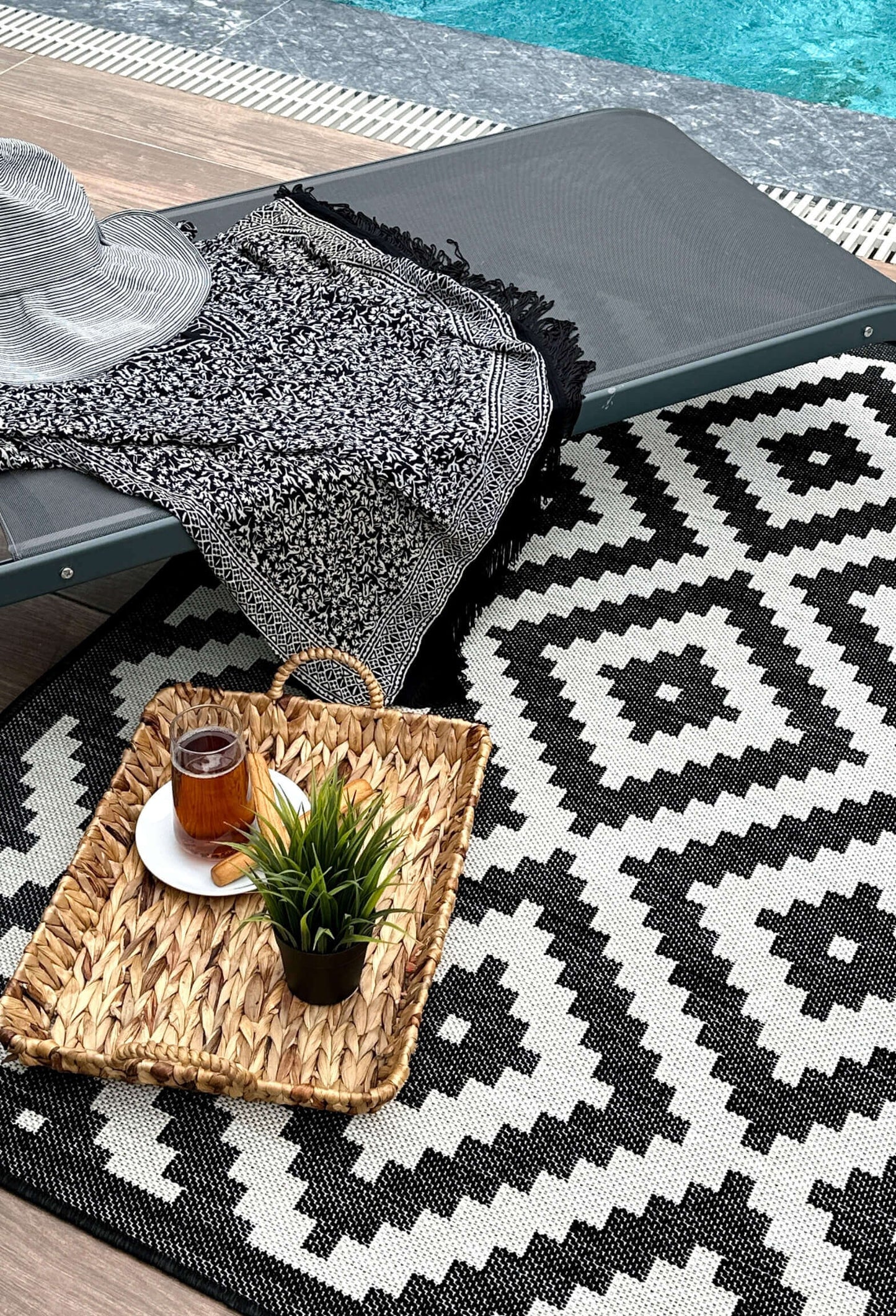 Diamond Design Black and White Outdoor Rug is extremely versatile and multifunctional: their colourful designs and stripes bring a refreshing variation in the gardens, patio, conservatory or even sometimes indoors.