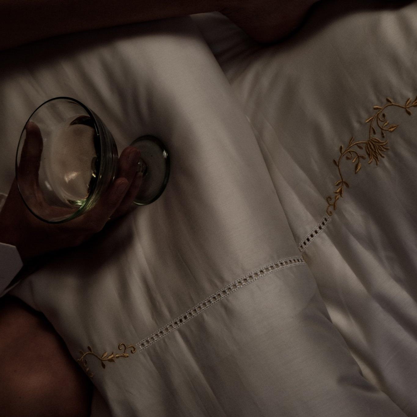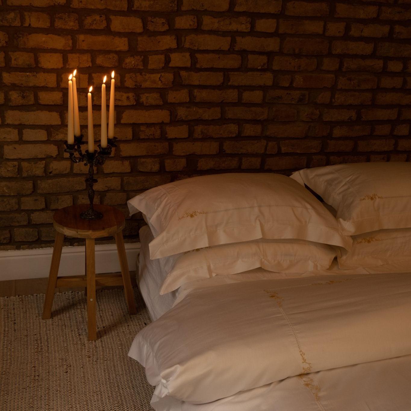 The duvet cover and pillow cases from this collection are intricately embroidered with a delicate floral pattern on pristine white sheets. The embroidery comes in a choice of 3 colours; dusty gold, lavender and white (For bulk and custom orders any colour can be embroidered). Embroidered detail is on all four sides of the duvet, sitting neatly atop the bed in a square interlaced with a ladder stitch design.