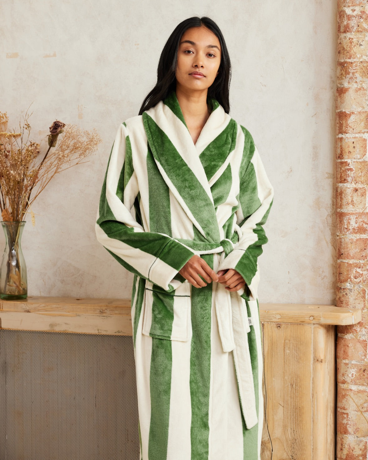 Classically elegant, this sage green and cream striped dressing gown is crafted from our most luxurious recycled fibres fleece fabric. Soft and almost silky to the touch, this plush robe features a shawl collar neckline and long self tie belt.