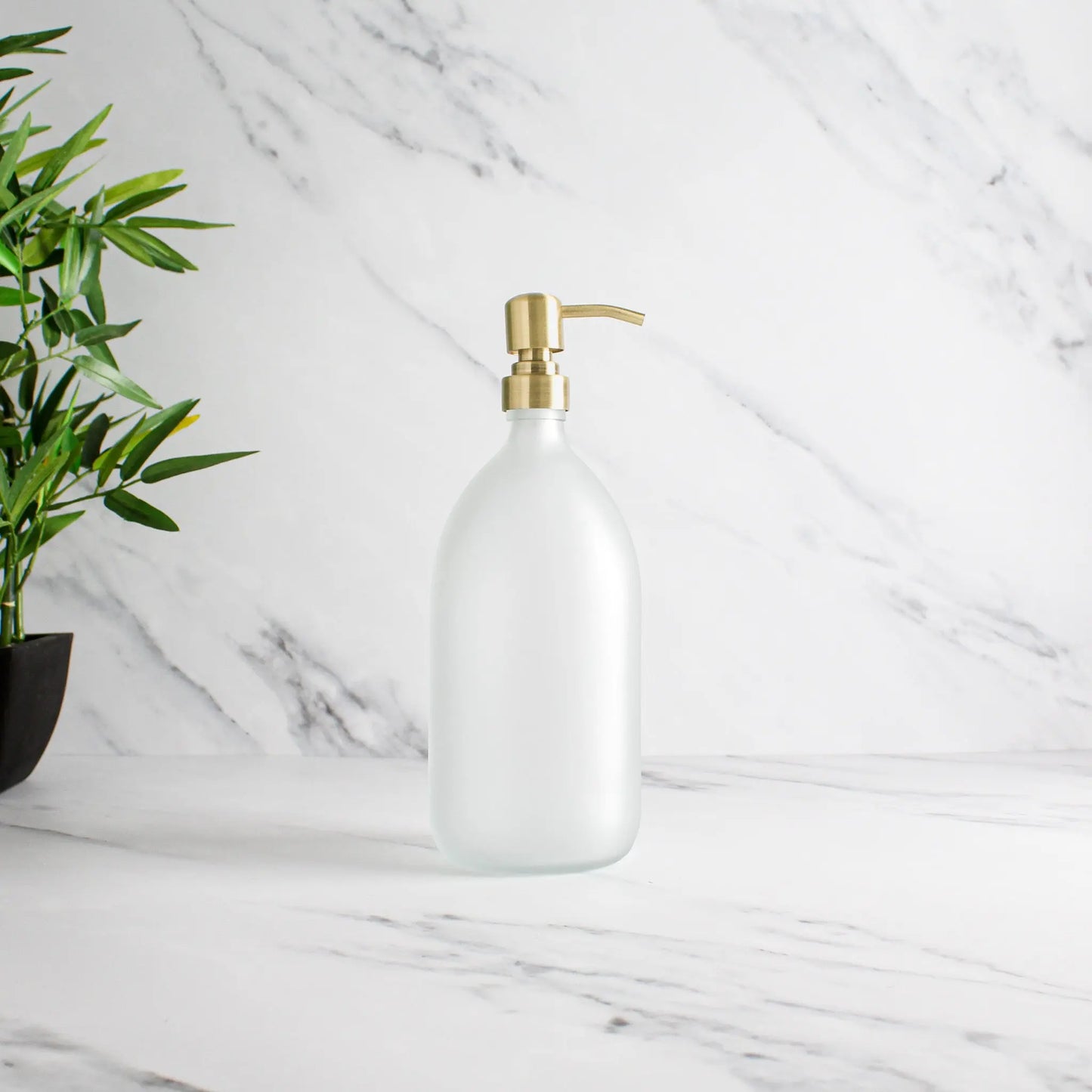 Frosted White Glass Dispenser Bottle With Gold Pump