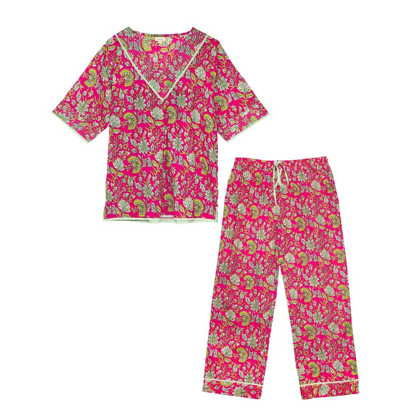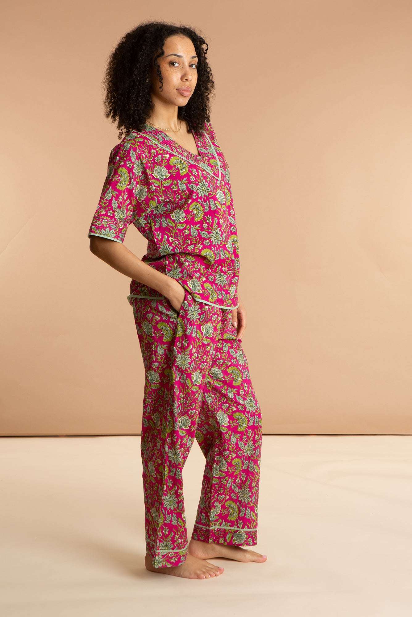Our Fuchsia Freesia women's cotton pyjamas set is inspired by vivid-pink South African fragrant funnel-shaped flowers. These luxury pjs feature a short-sleeved V-neckline loose top and straight leg pyjama bottoms, which are carefully printed and pre-washed, leaving the soft and breathable 100% Indian cotton a dream to wear. Our bold printed loungewear compliments both your early nights and late mornings.