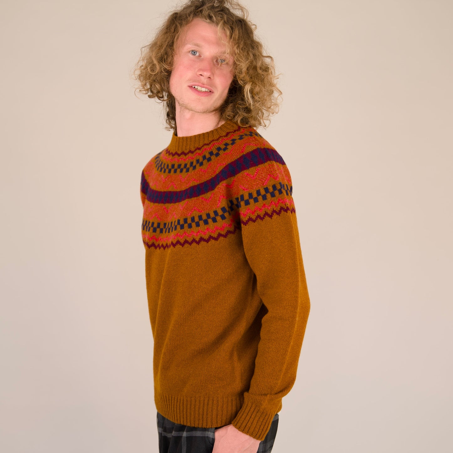 The unmistakable geometric patterns of the Fair Isle jumper have become a symbol of British culture and has long been a favourite of the Royal Family dating back to the 1920s. The Soho is our most technically advanced jumper due to the complex knitting techniques required for the seamless yoke pattern.