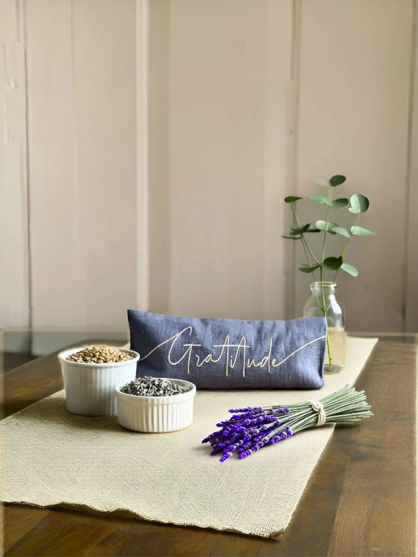 Our Gratitude embroidered lavender eye pillow is made with French linen and filled with organic lavender flower buds and organic wheat grains. Each one is stitched by hand, filled to the perfect weight, and designed to rest gently over your eyes, helping to ease tension, dissolve stress, and support deep rest.
