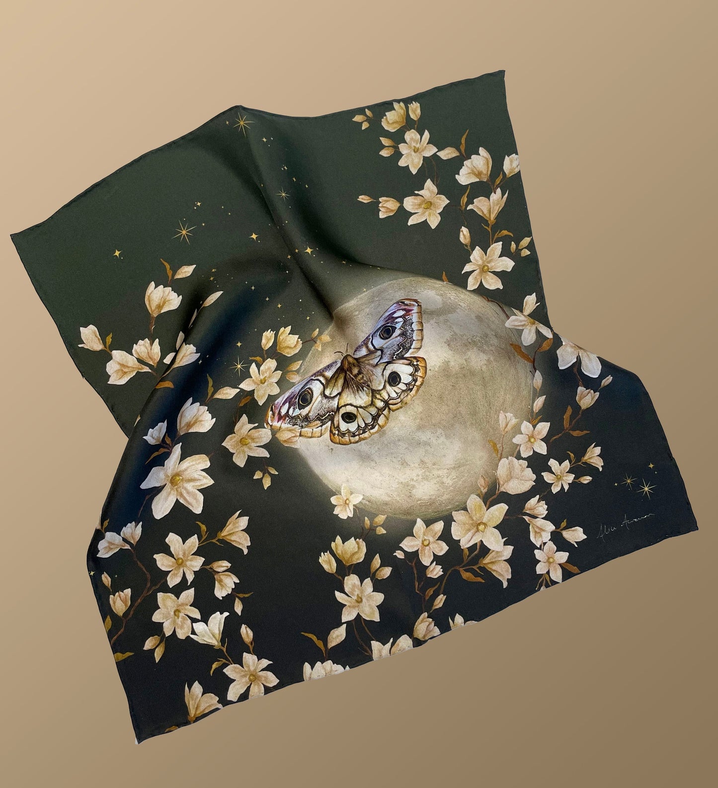 In this hand painted design, the deep green colour and botanical illustration evokes a magical nature scene with a striking moth and full moon design. Stars dance around the central motif and create a sense of awe and wonder with the celestial theme.