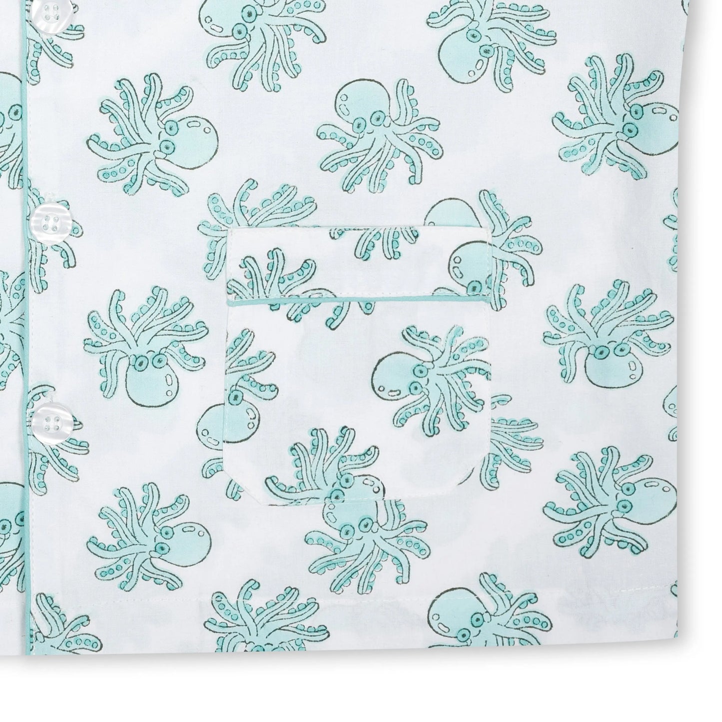 Gorgeous pyjamas hand printed with a fun green octopus block design.