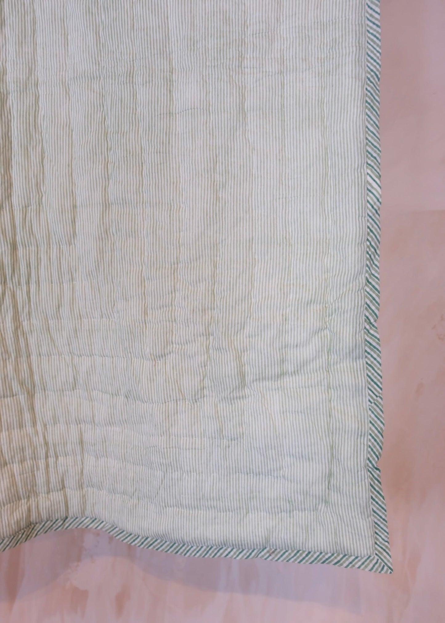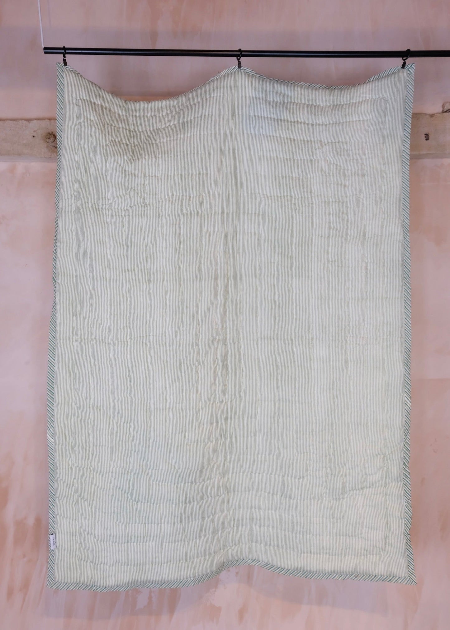 A large organic cotton cot quilt. The cot quilt size can be used in a variety of ways including as a cot quilt, bed quilt, play mat and pram blanket. The are a super lovely addition to a bedroom or nursery.