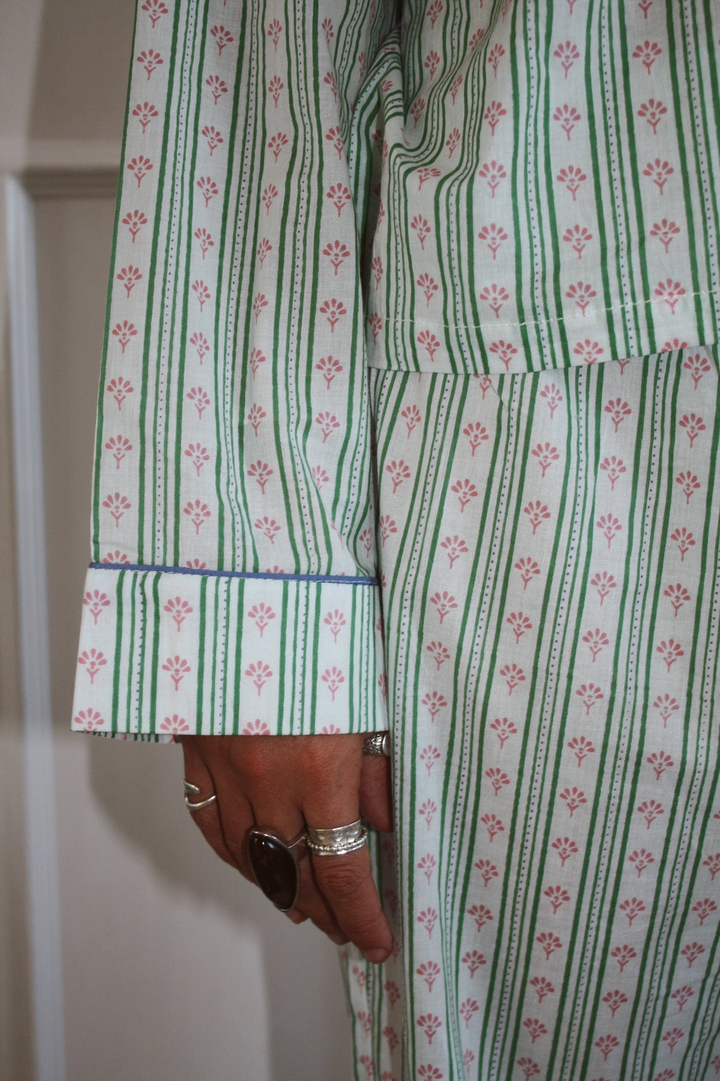 Our green ditsy stripe pyjamas are designed with a pink flower stripe and a soft cornflower blue piping, combining classic stripes with block printing motifs. They are handmade by artisans in Jaipur and come in a matching pyjama bag. Their oversized, boxy fit and supersoft cotton are perfect for cosy nights in. The fabric is hand printed so please allow for discrepancies in designs as each set is unique.