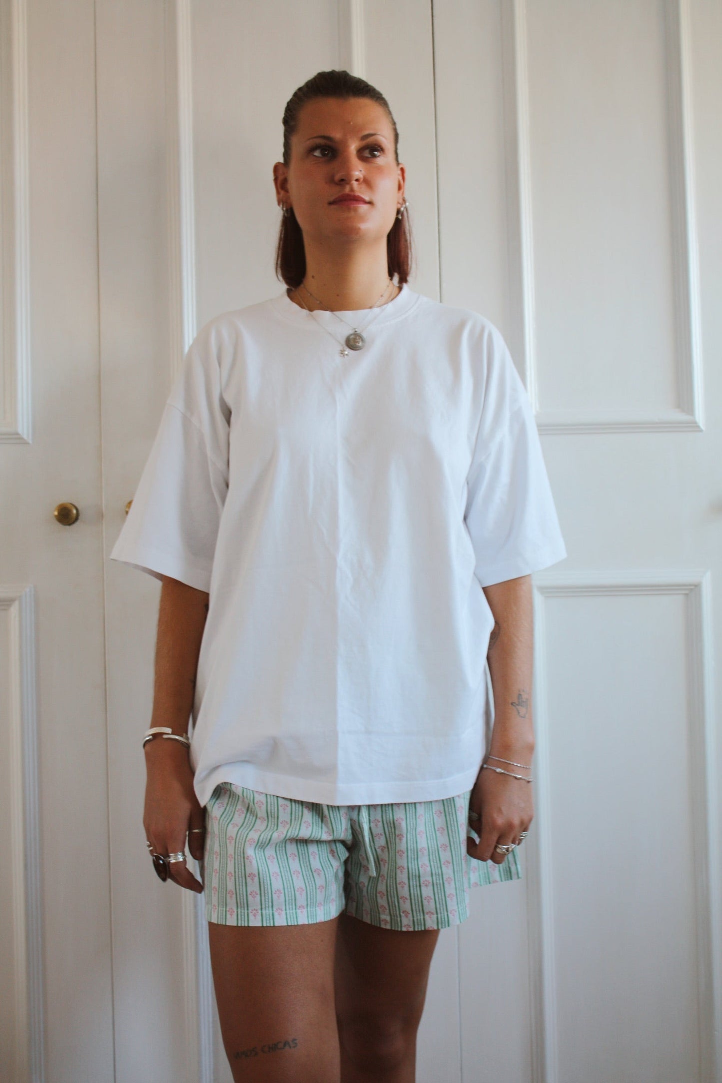 Our green ditsy stripe shorts are designed with a pink flower stripe and a soft cornflower blue piping, combining classic stripes with block printing motifs. All our shorts are handmade and printed by artisans in Jaipur. The elasticated waist, drawstring and supersoft cotton are perfect for taking you from your bed to the beach! The fabric is hand printed so please allow for discrepancies in designs as each set is unique.