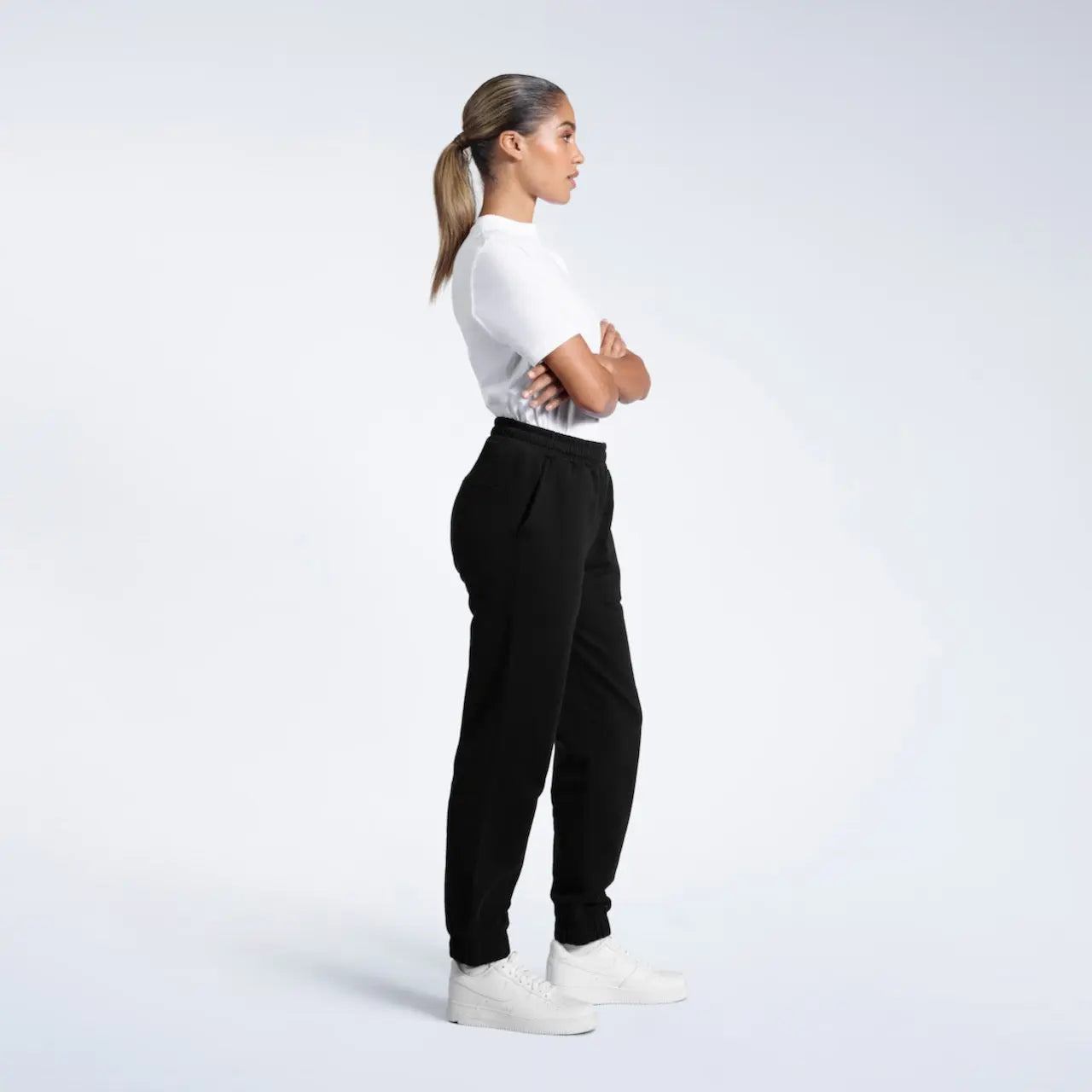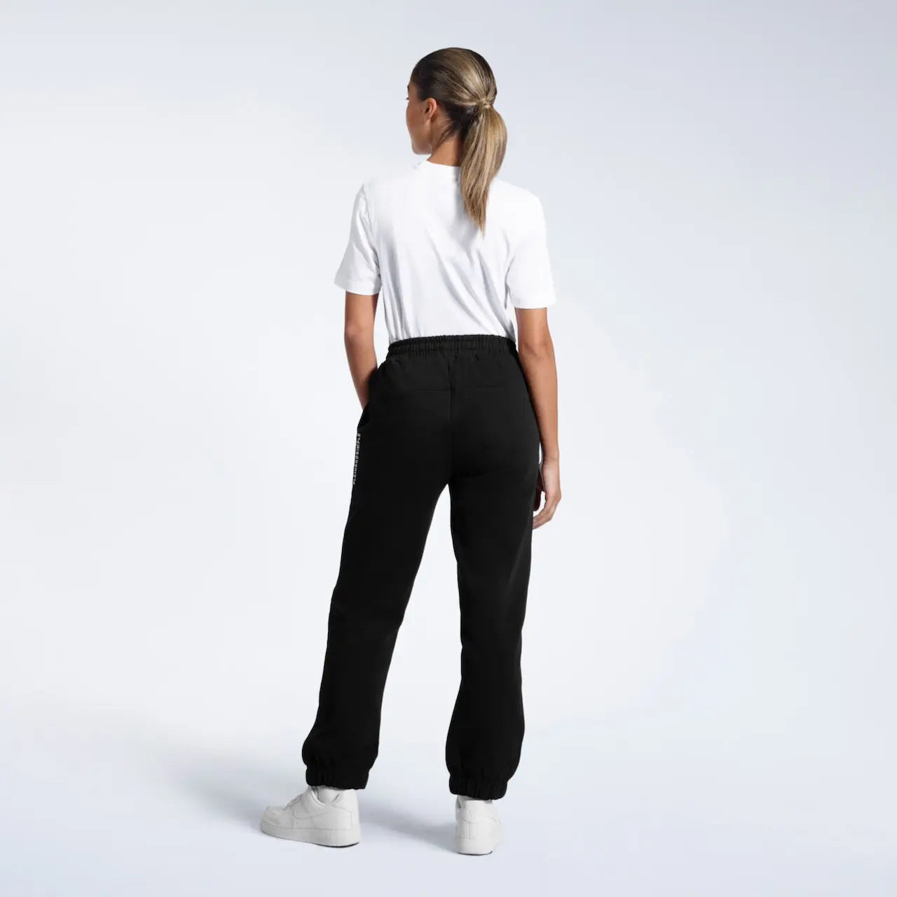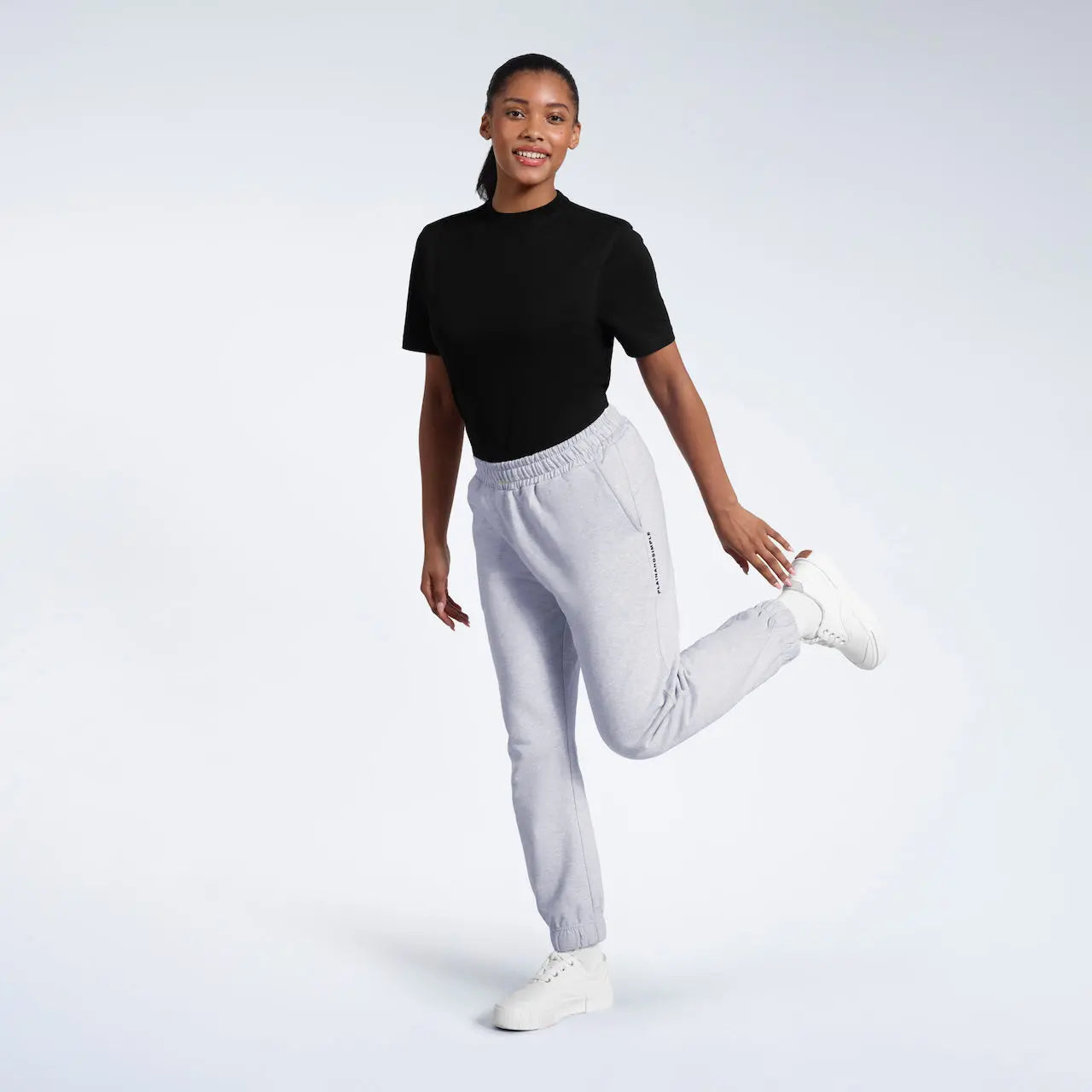 - Black joggers model: Height 5'6" (168 cm), wearing size S