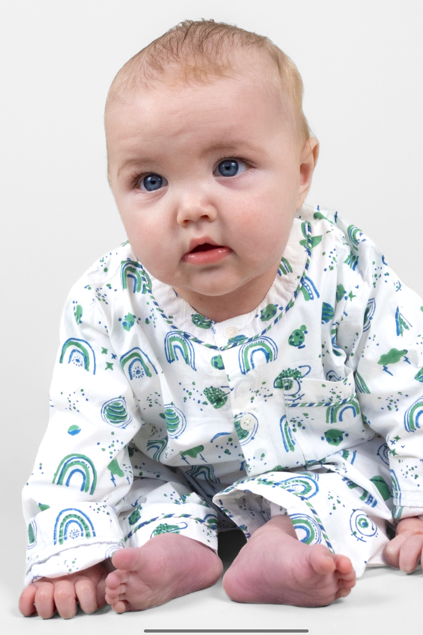 Take your little dreamer on a quirky adventure with this PJ set, featuring an eclectic mix of rainbows, planets, and thunderclouds. Perfect for kids who thrive on the unconventional love the unexpected. Our PJs bring together wild prints and comfy styles, letting every kid show off their unique vibe.