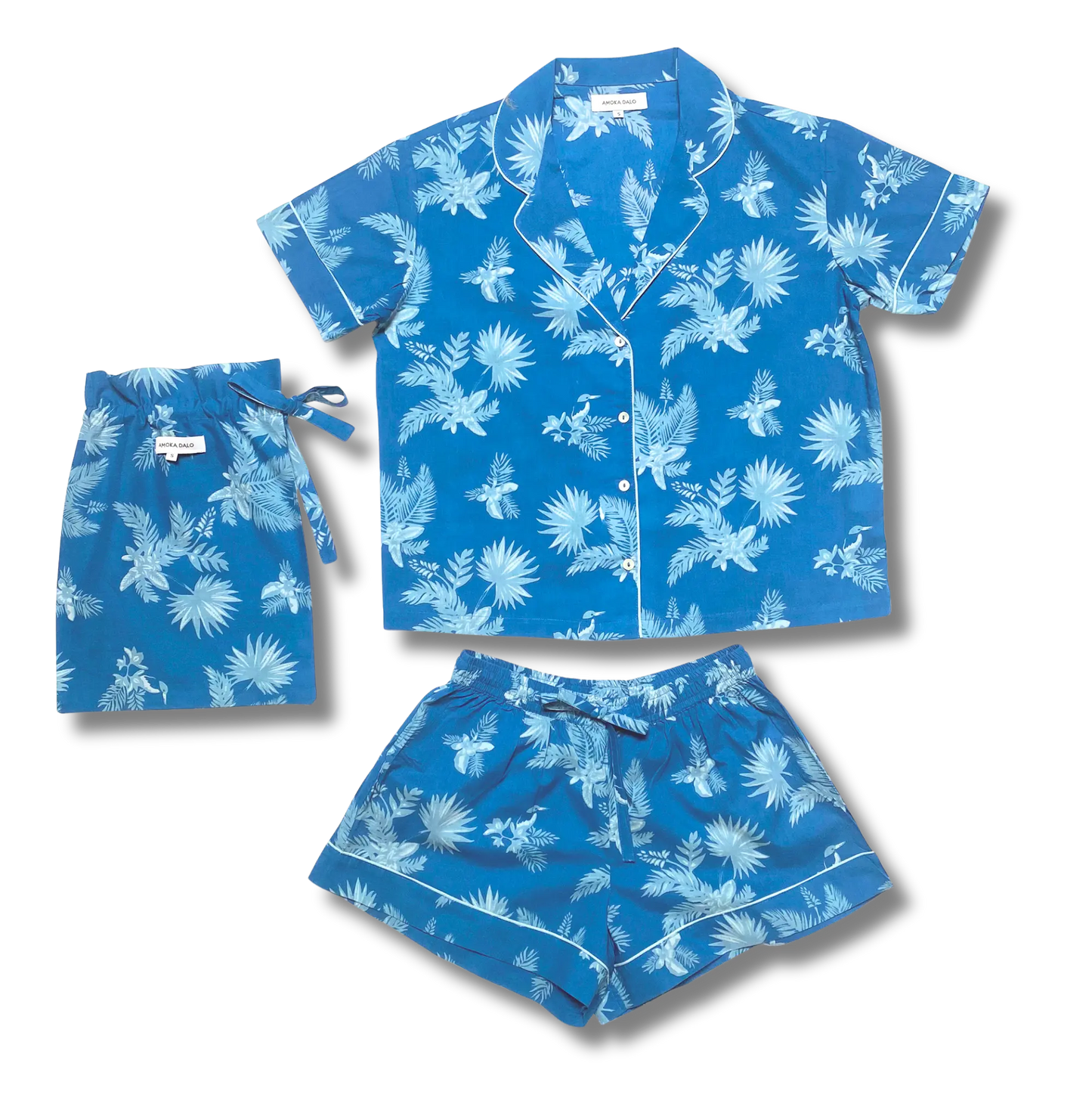 Inspired by the lush greenery and ocean breeze of Ipanema Beach in Rio de Janeiro, the striking blue botanical print channels the serene beauty of tropical forests. This eco-friendly short set is designed for relaxed days at home, warm summer nights, or stylish holiday lounging.