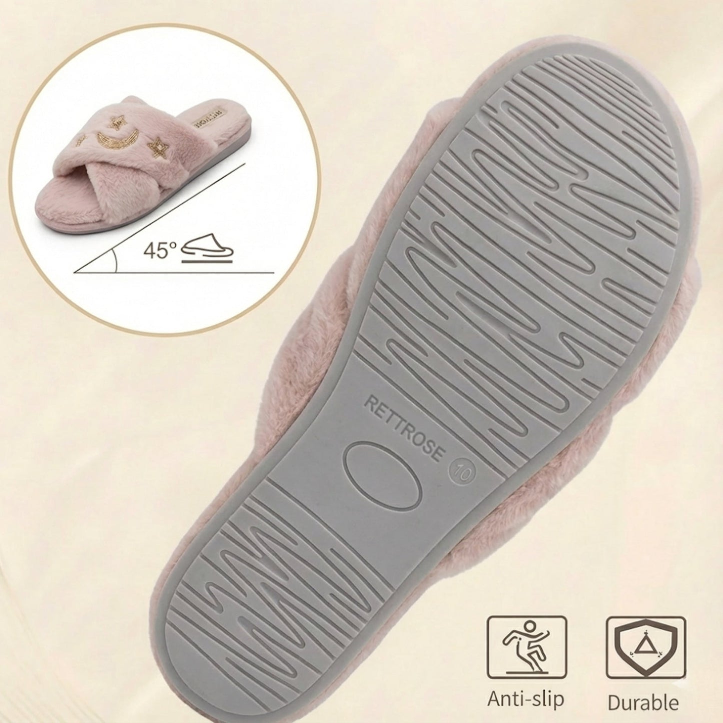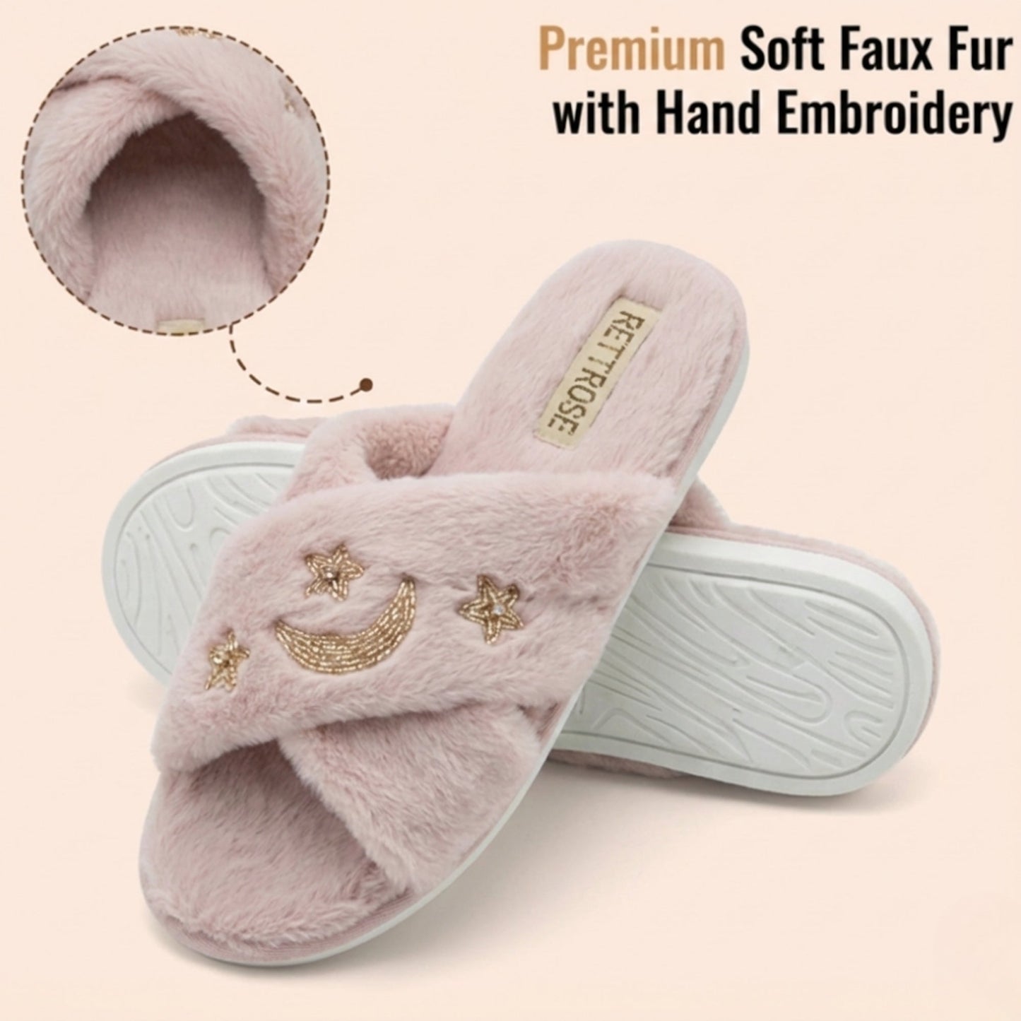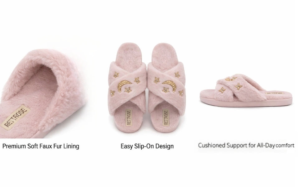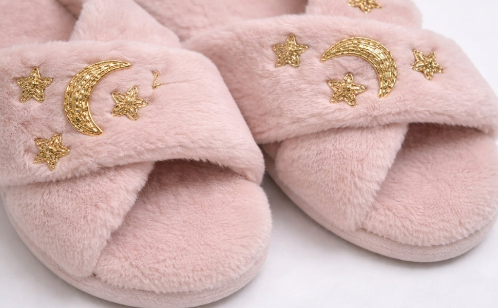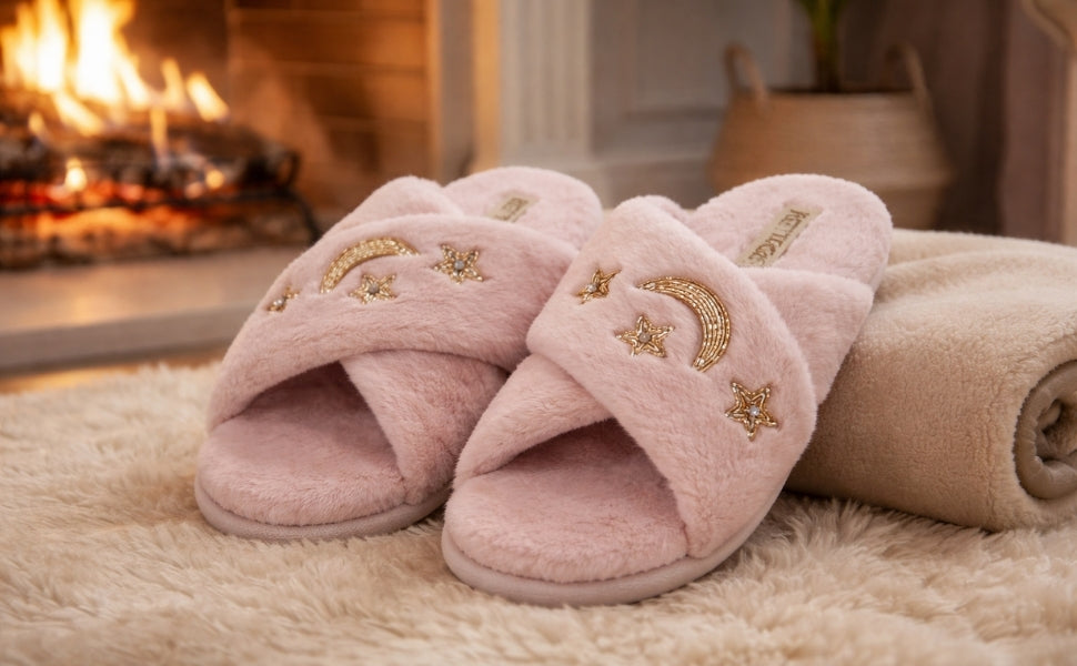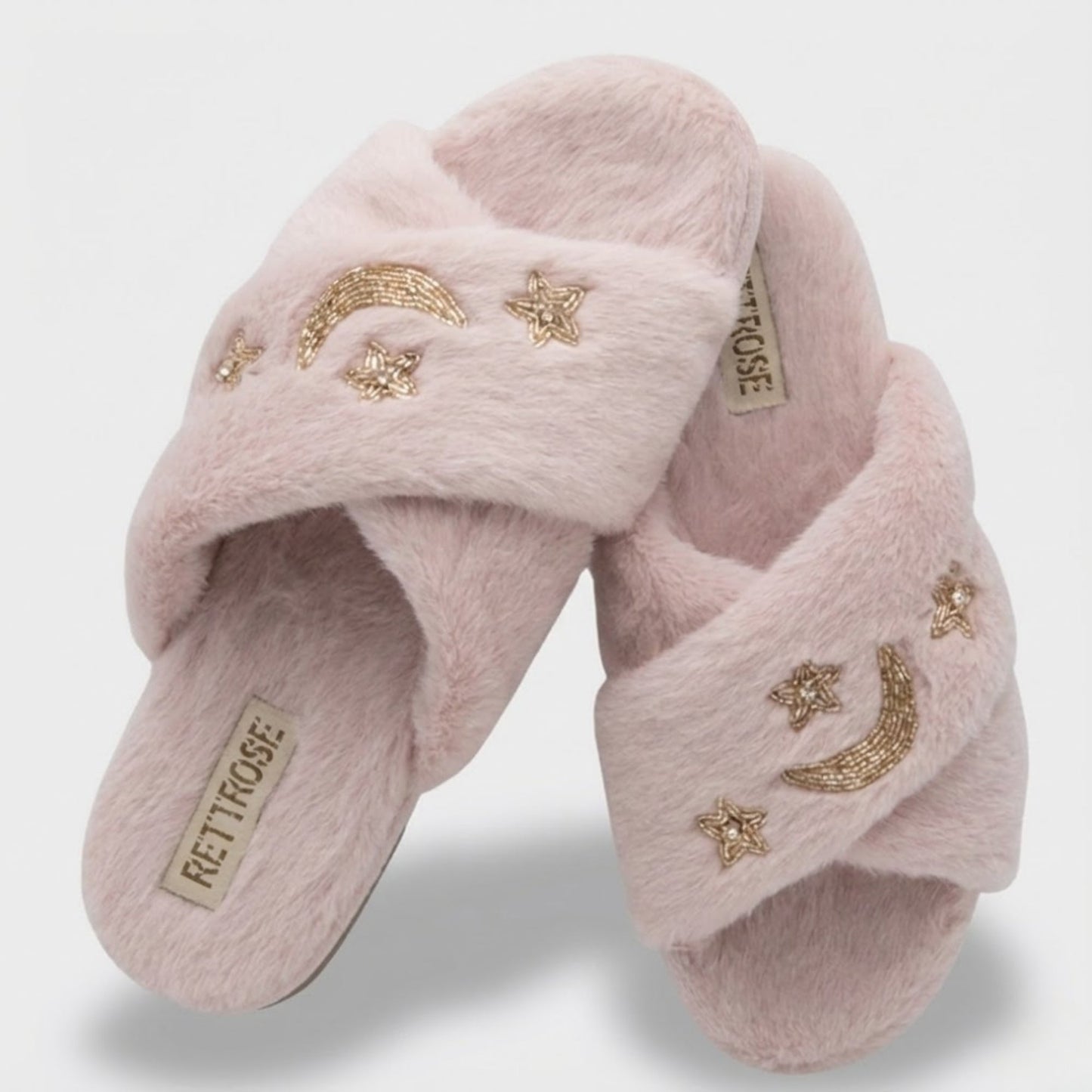 The Isabel Dusky Pink Luxury Plush Diamanté Embellished Handmade Slipper features a heavy plush faux fur fabrication with a hand embellished star & moon appliqué featuring a variety of luxury dazzling diamanté.