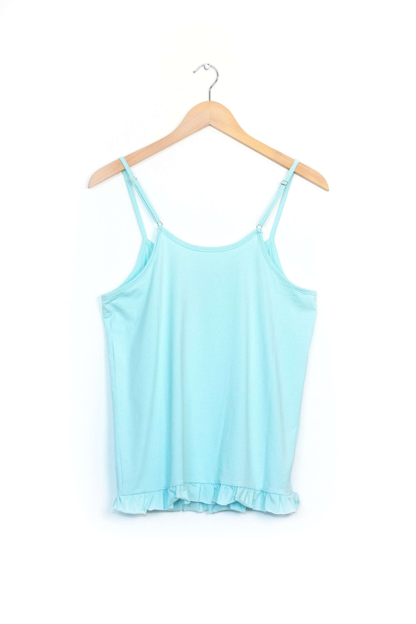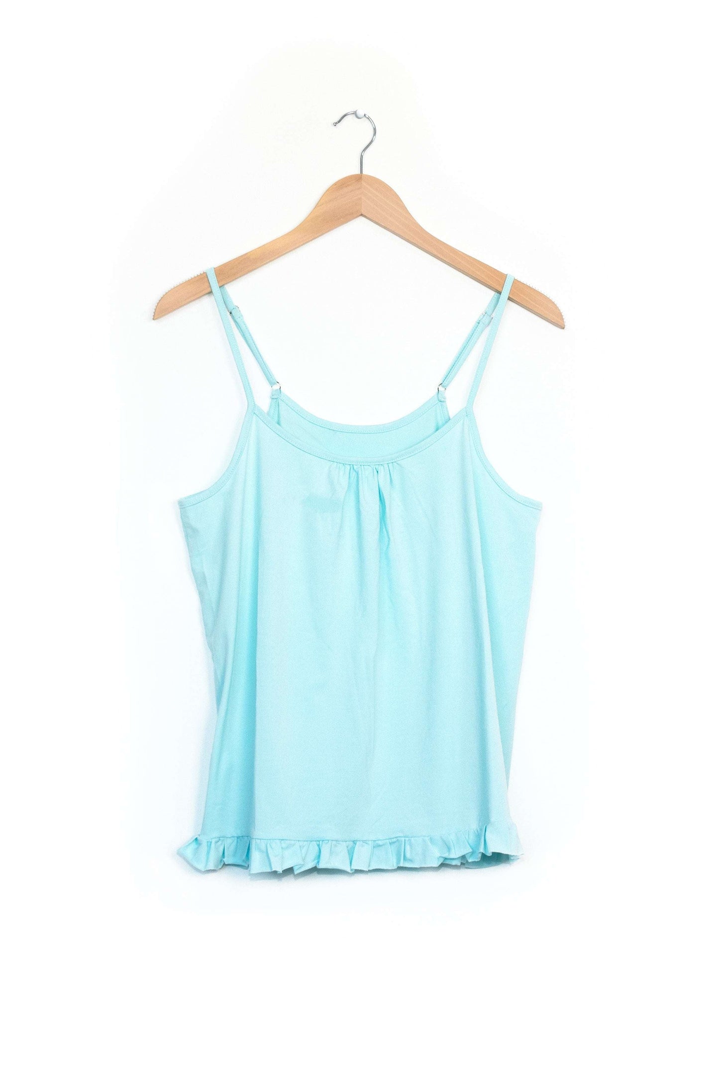Our Isla women's aqua camisole top in teal balances the bold patterns of our pyjama bottoms or shorts. Featuring spaghetti straps across a scooped, slightly gathered neckline, and a cute flounced hem that hits at the waist, this tank top easily transitions between loungewear and an everyday piece.