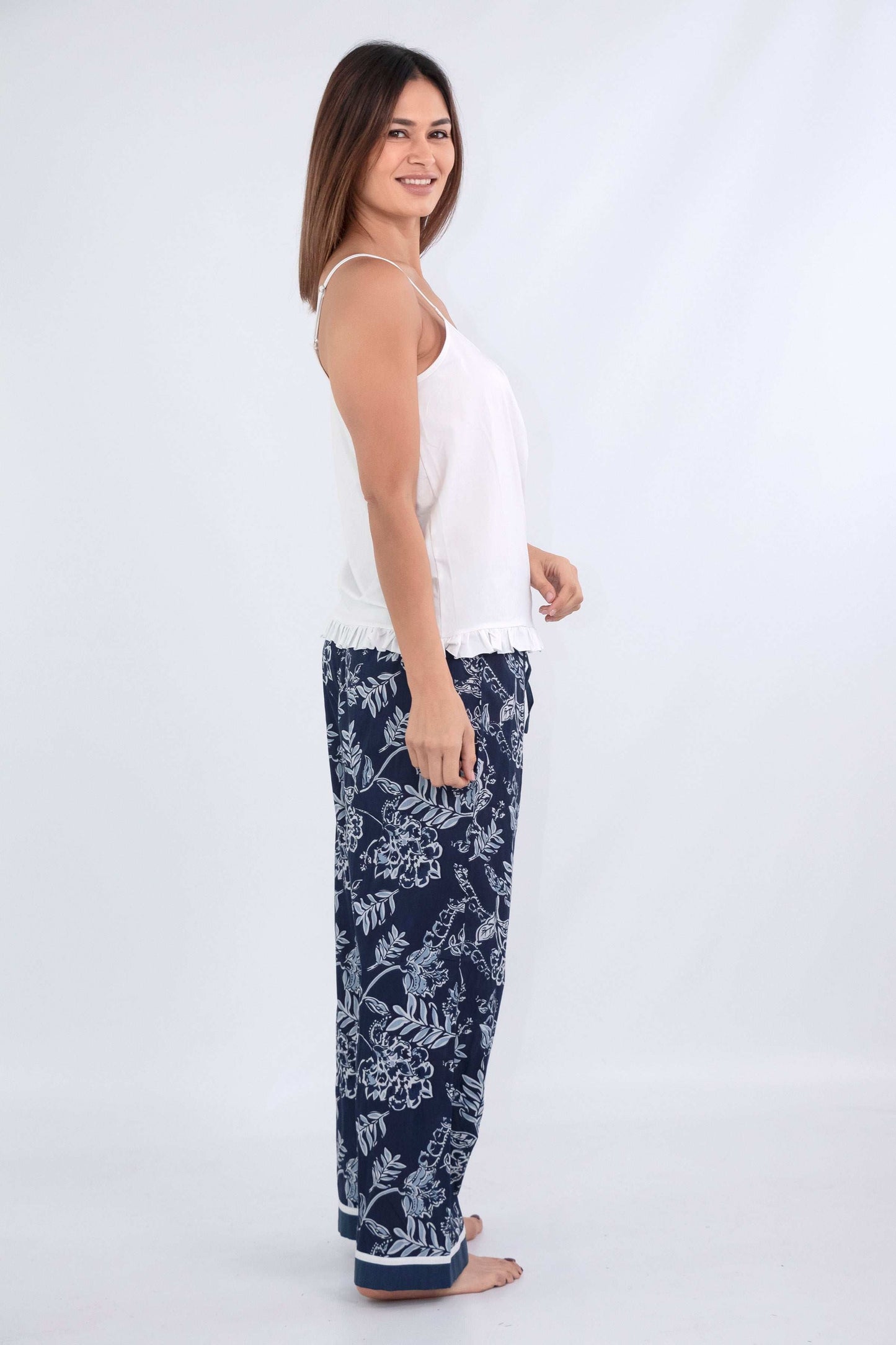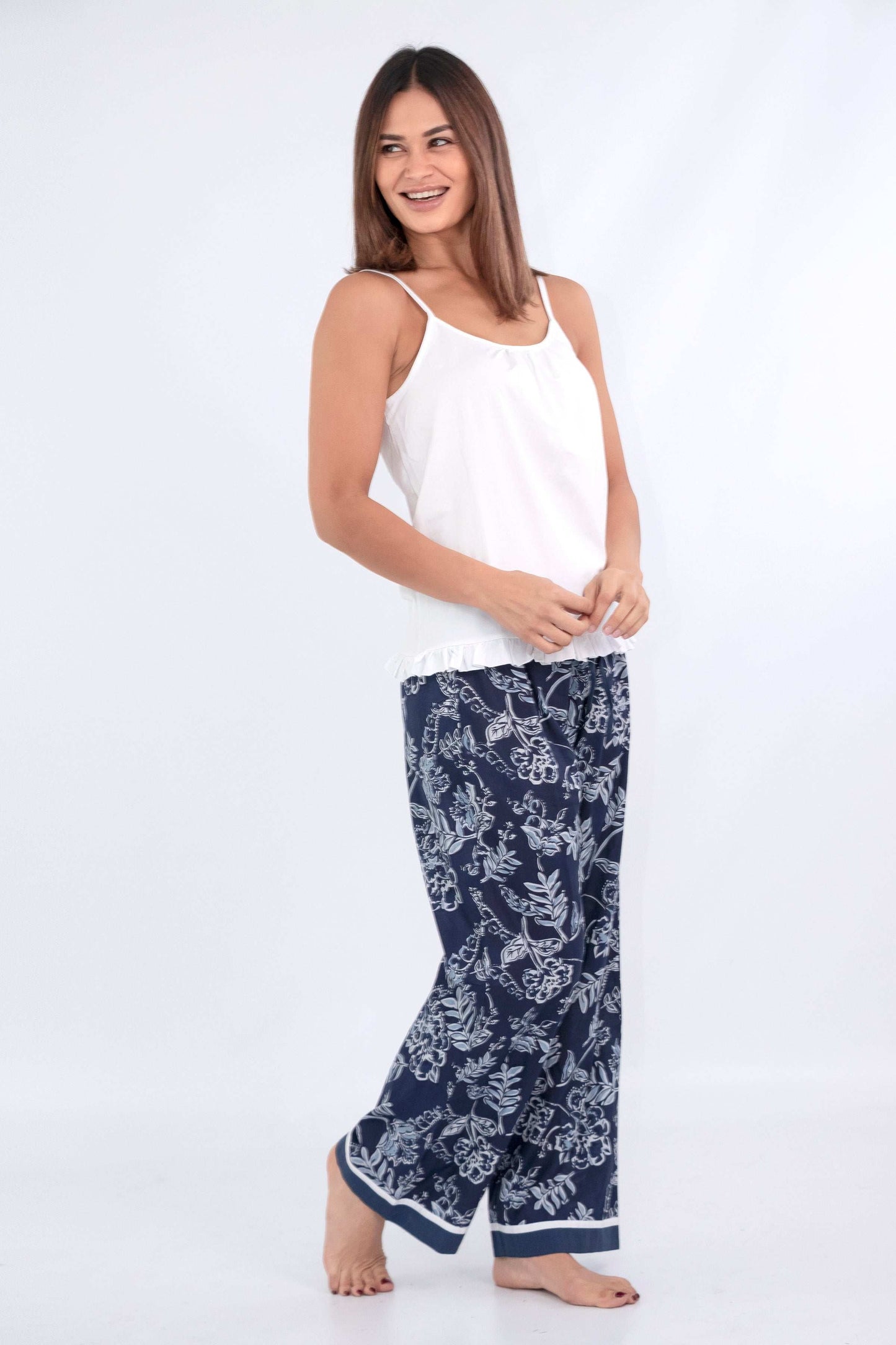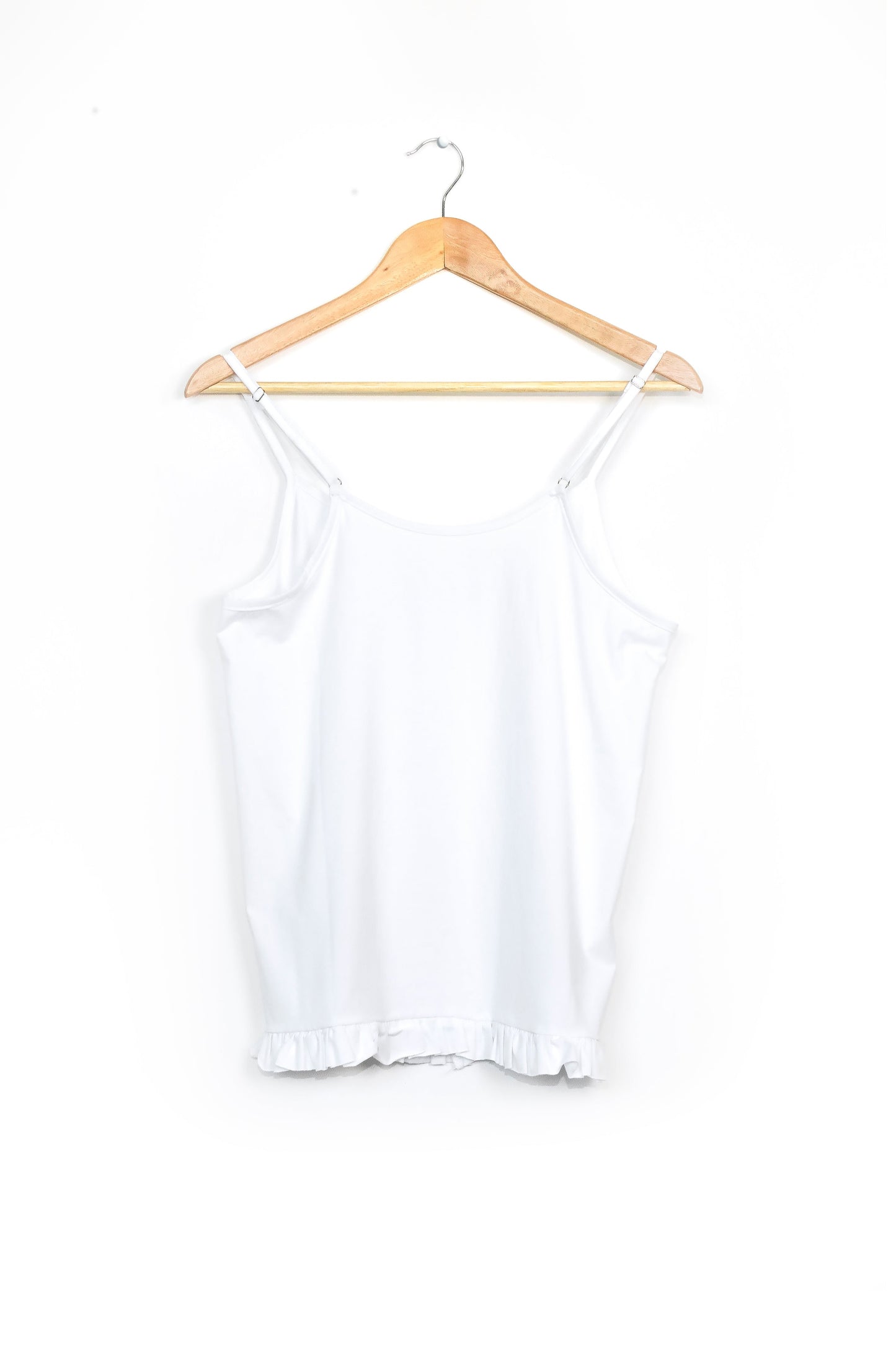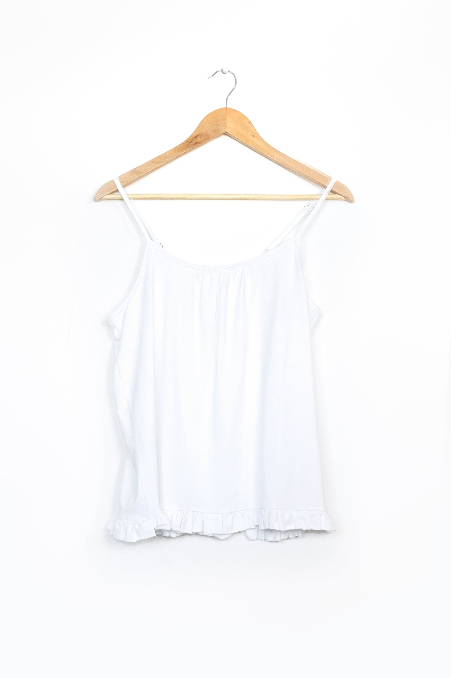 Our Isla women's white camisole top balances the bold patterns of our pyjama bottoms or shorts. Featuring spaghetti straps across a scooped, slightly gathered neckline, and a cute flounced hem that hits at the waist, this tank top easily transitions between loungewear and an everyday piece.