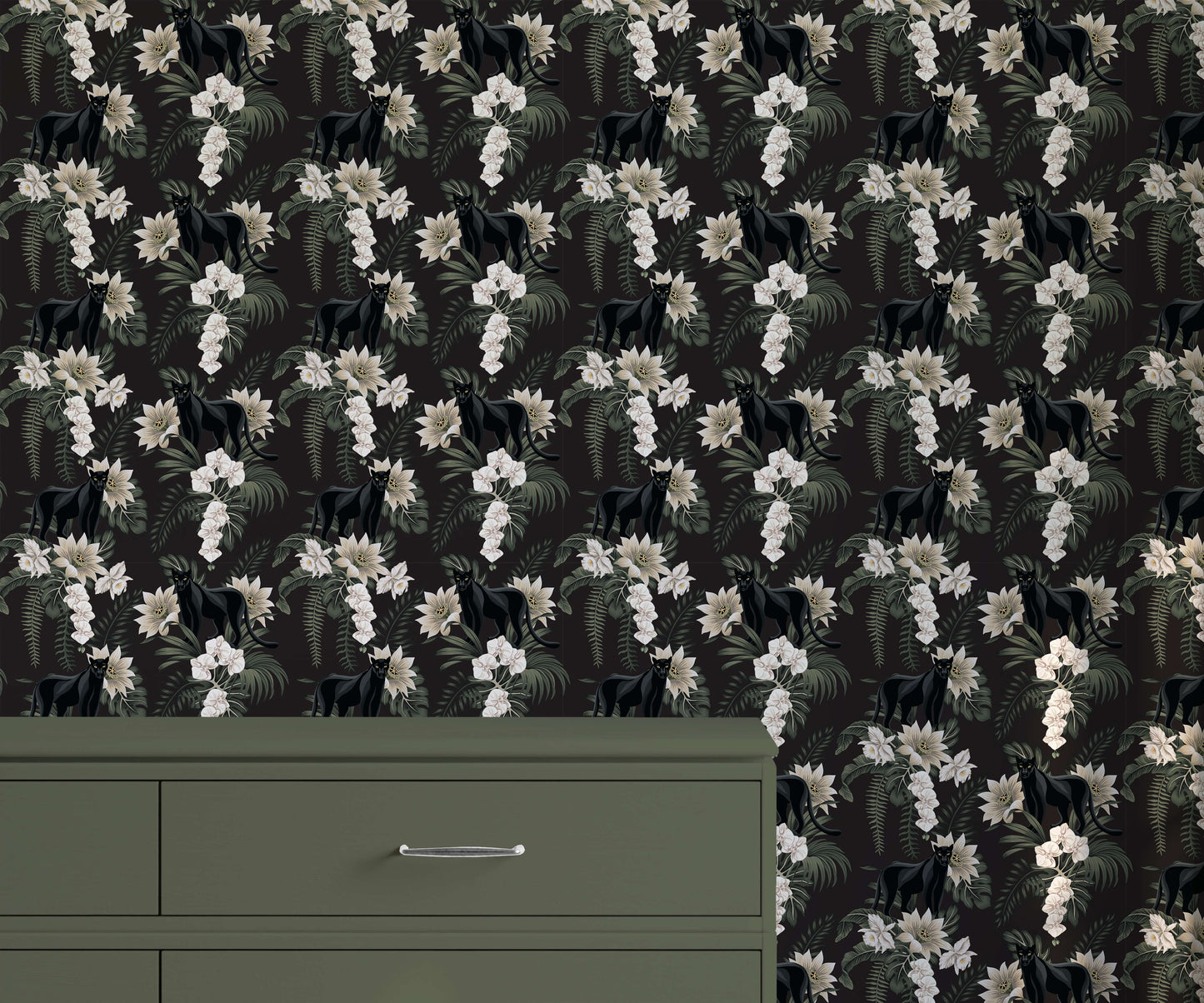 As the black panther takes centre stage, surrounded by the intricate details of fern leaves and flowers, the wallpaper becomes a focal point that exudes a sense of wild elegance. The delicacy of the botanical elements adds a unique dynamic to your interior decor, inviting a touch of the untamed into your living space.