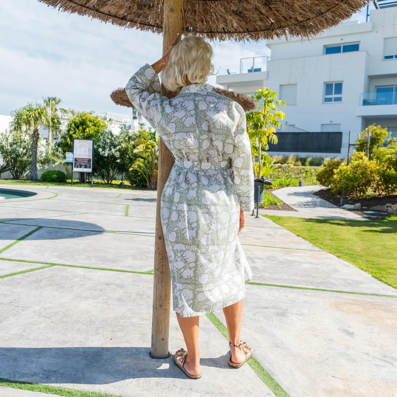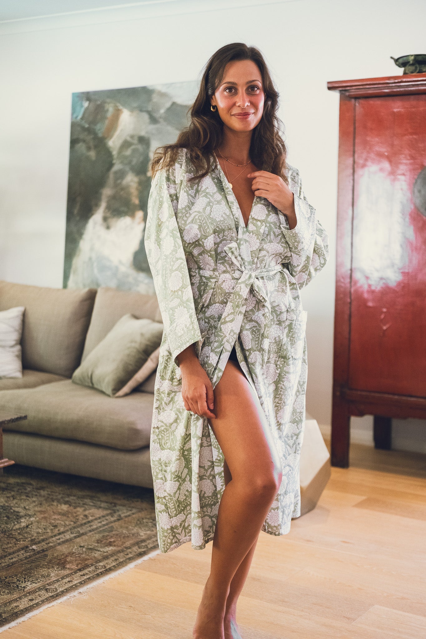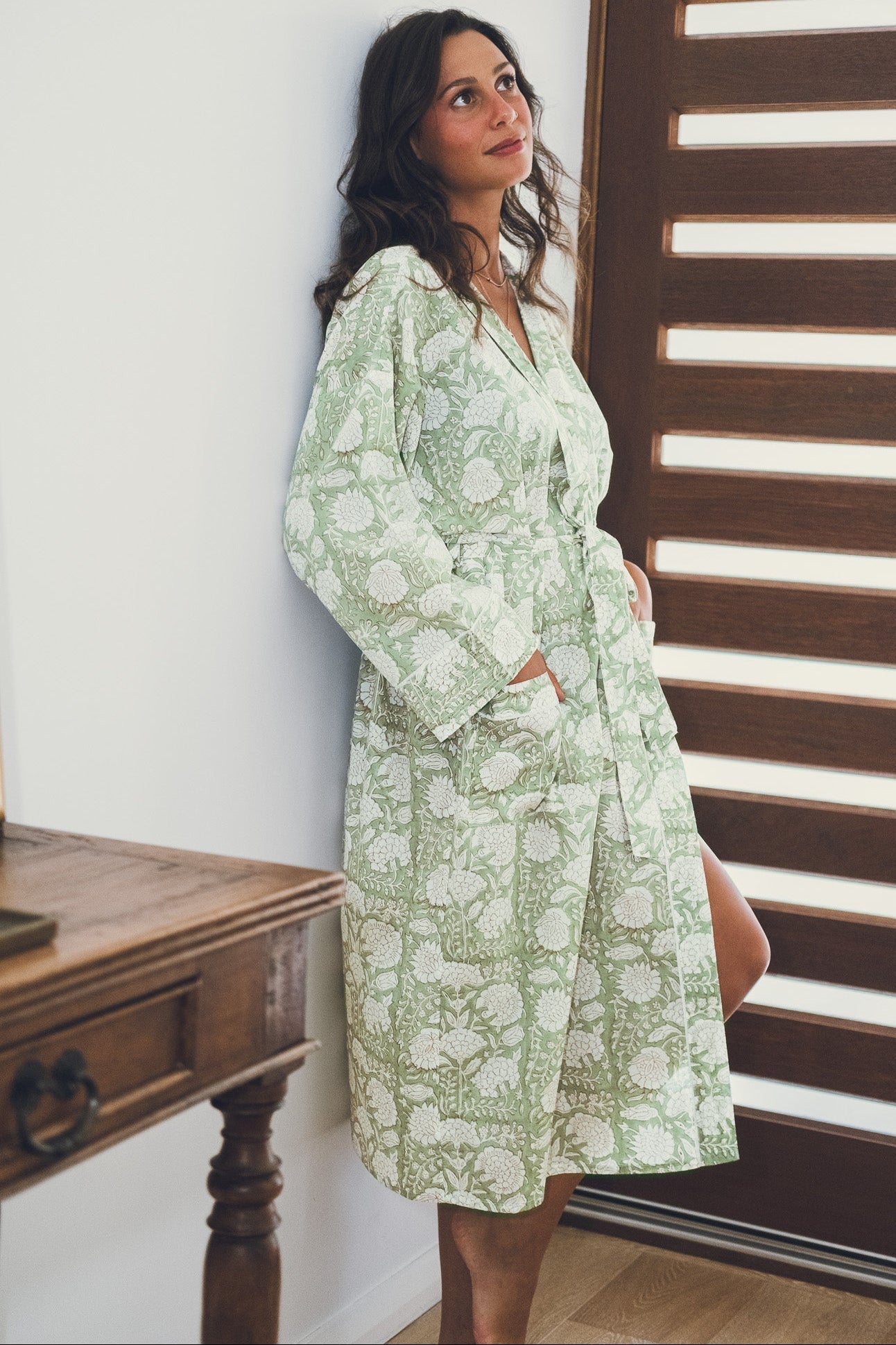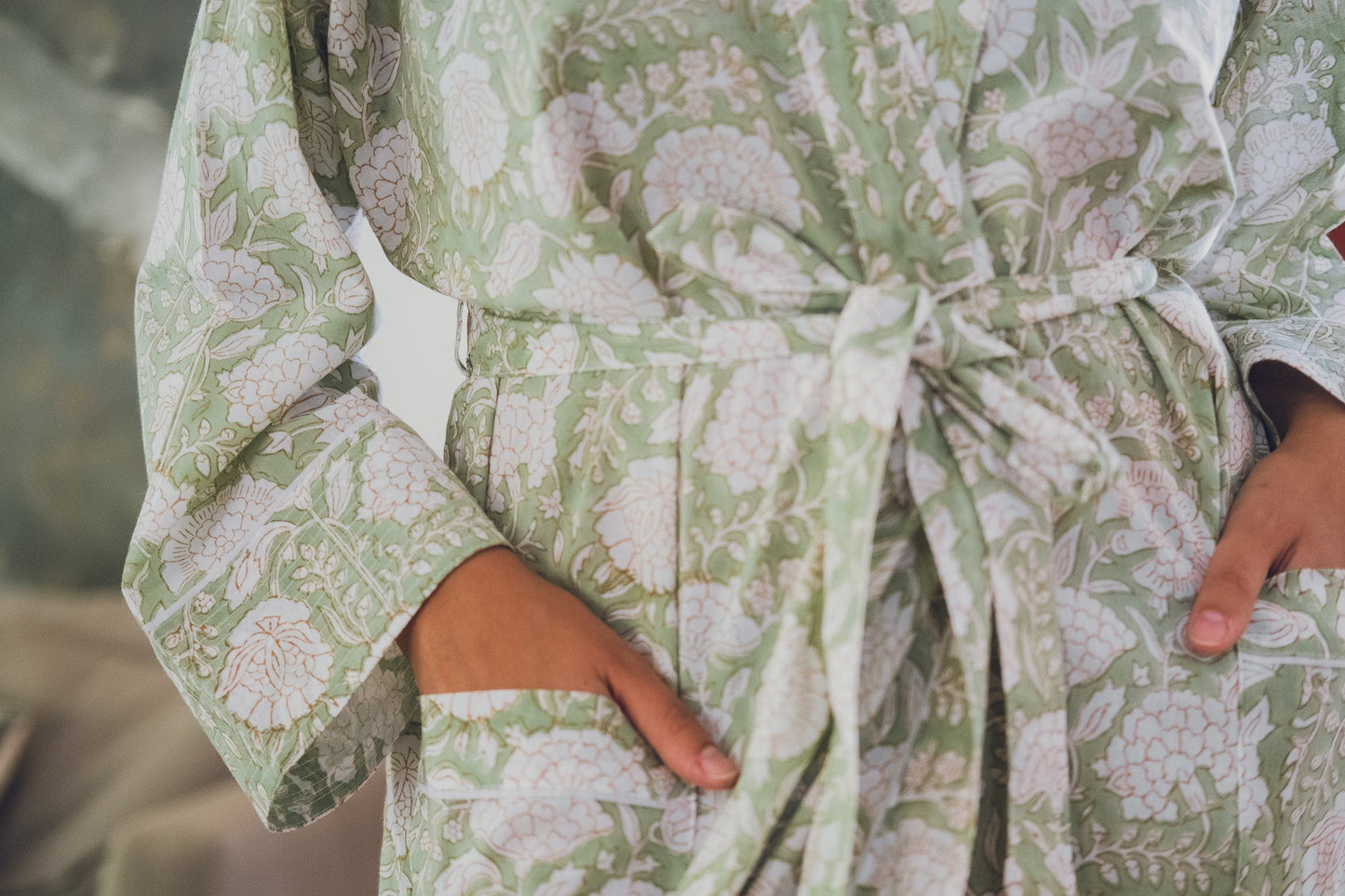 Our Kesar robe, inspired by the delicate colour of pistachio green combined with a vintage pattern, is our new colour addition . Our light cotton robes are handmade by our artisans in Jaipur, made with the purest of Indian cotton makes it breathable and luxuriously comfortable. The light material makes it the perfect addition to your suitcase for those holidays where you wish you had packed something to lounge in to sip your morning coffee or wind down reading a book in the evening.
