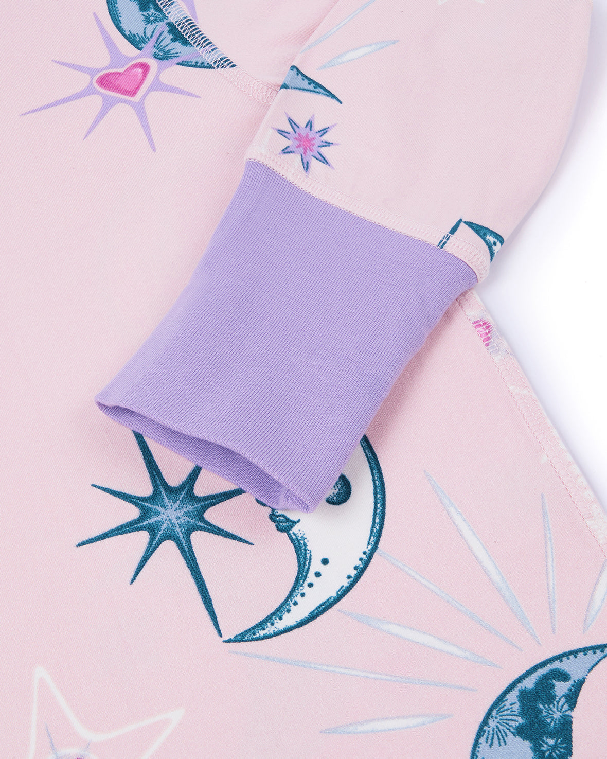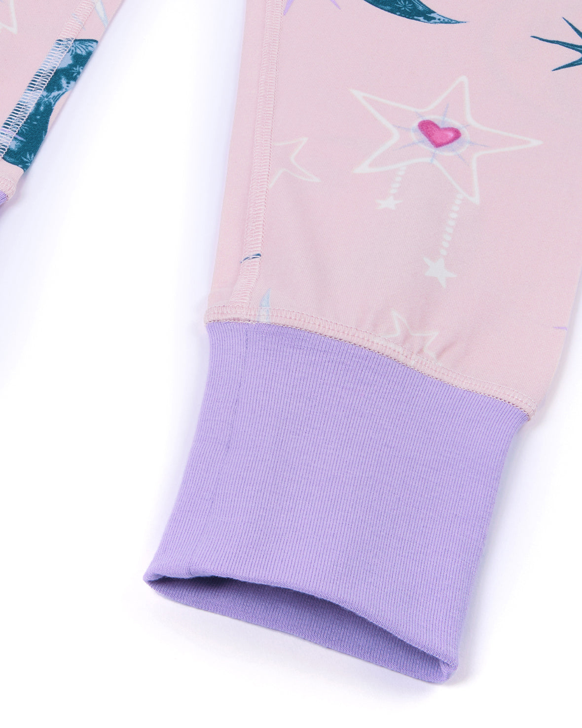 Send your little stargazer off to dreamland with our Astral Hearts kids' pyjama set, a playful blend of cosmic charm and all-night comfort. Sprinkled with twinkling stars, pink hearts, and magical moons, this dreamy print brings the night sky to life in soft recycled jersey. Designed with a comfy crew neck top and easy pull-on bottoms, the set features ‘grow-with-me’ extra-long cuffs that can be folded over to fit and rolled down as they grow, and a tagless finish for itch-free, sensory-friendly wear. With a gentle elasticated waistband and plenty of wiggle room, it’s perfect for everything from starry sleepovers to bedtime moon missions.