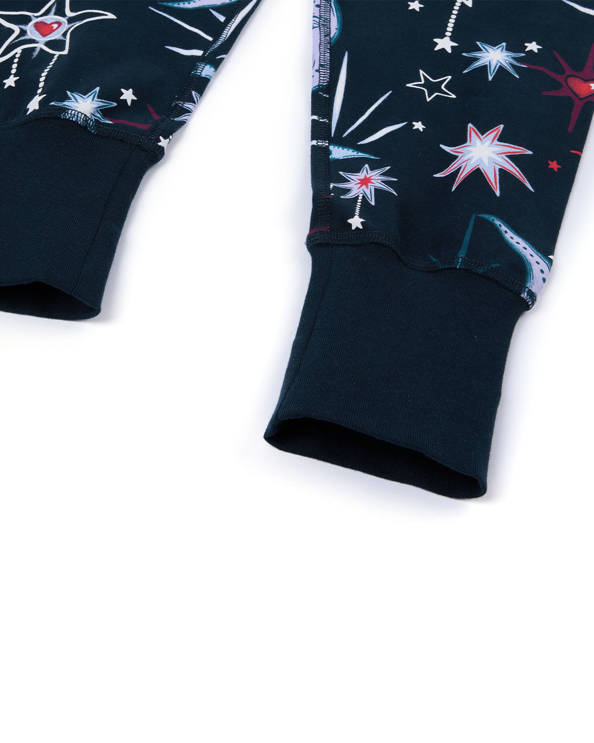 Crafted from our favourite certified organic cotton, these classic crew long sleeve t-shirt and jogger style bottom pyjamas are printed with hand-drawn crescent moons and glittering stars in this mystical night sky. 'Grow-with-me' extra-long cuffs and hems extend the lifetime of these hard-wearing pjs, simply fold over the cuffs to the perfect length, and roll down as your little one grows.