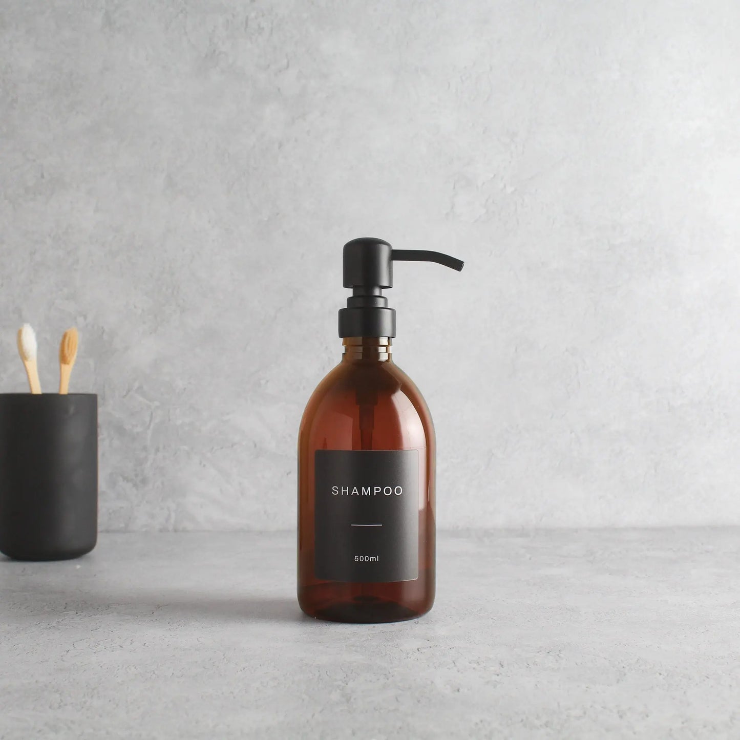 Labelled Amber Plastic Dispenser Bottle With Matte Black Pump